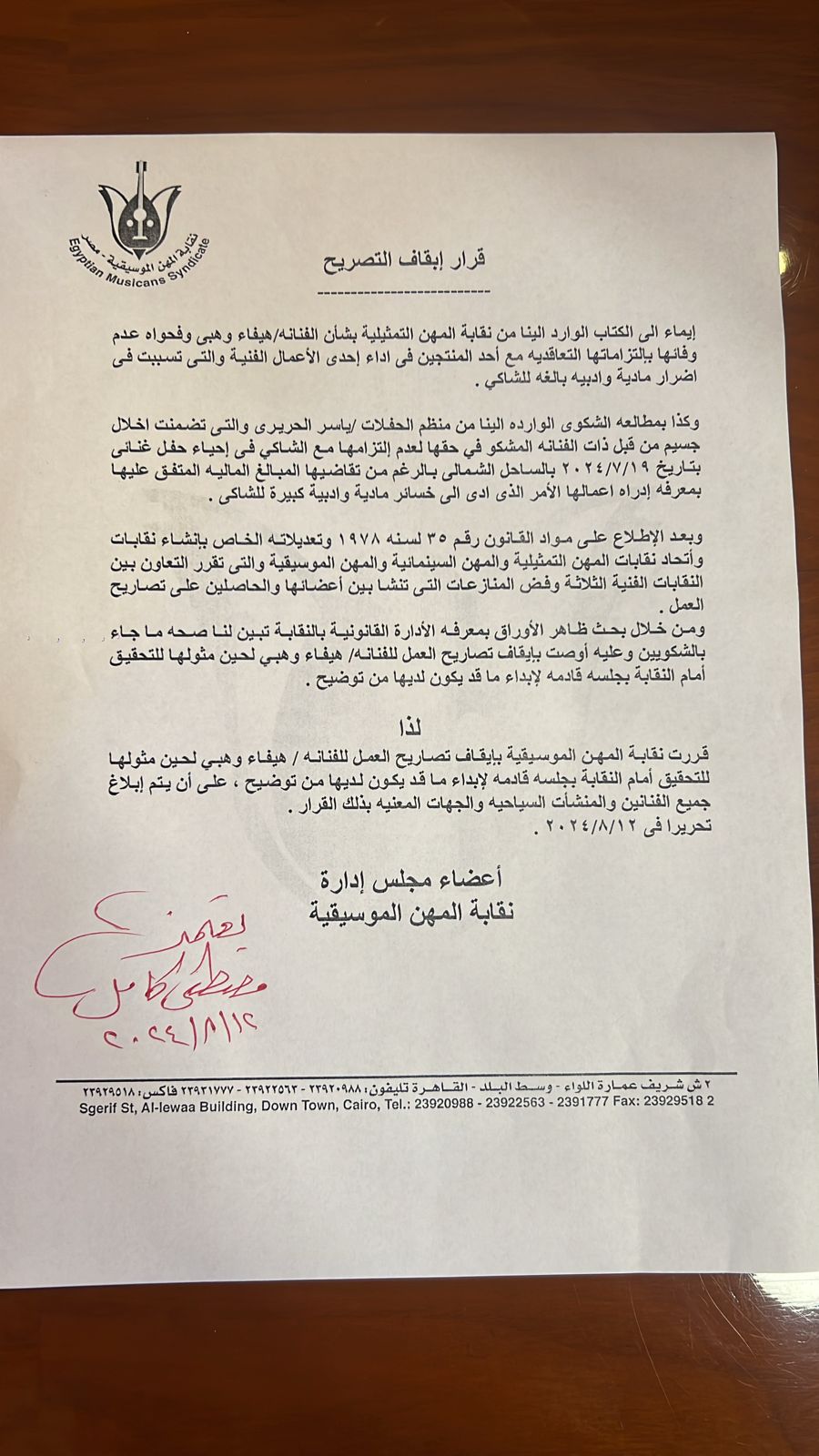 وبعد فحص الشكوى تبين صحة كل ما جاء على لسان الشاكي لتتلاقى إدارة وقرارات لجنتي التحقيق والشئون القانونية بنقابتي المهن الموسيقية والتمثيلية، حيث قررا عدم منح أي تصريح عمل للفنانة هيفاء وهبي لإقامة حفلات فنية أو ممارسة مهنة التمثيل لحين فض المنازعات الواردة للنقابتين.