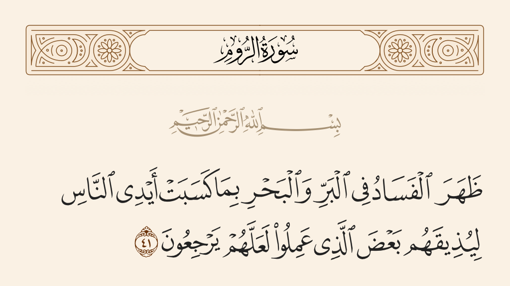 قال تعالى: «ظَهَرَ الْفَسادُ فِي الْبَرِّ وَالْبَحْرِ بِما كَسَبَتْ أَيْدِي النَّاسِ لِيُذِيقَهُمْ بَعْضَ الَّذِي عَمِلُوا لَعَلَّهُمْ يَرْجِعُونَ».