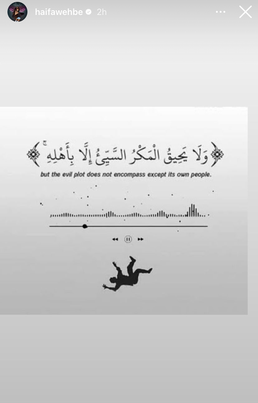وقالت هيفاء وهبي عبر حسابها الرسمي بموقع تبادل الصور والفيديوهات إنستجرام، نص الآية القرآنية الكريمة: ولا يحيق المكر السيئ إلا بأهله.