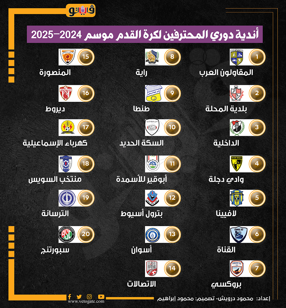 أندية دوري المحترفين لكرة القدم موسم 2024-2025 (إنفوجراف) الخميس 15/أغسطس/2024 - 06:00 م 8/15/2024 6:00:22 PM المقاولون محمود درويش شارك طباعة 18 حجم الخط شارك طباعة المقاولون العرب الدوري الممتاز دوري المحترفين دوري القسم الثاني القسم الثاني بلدية المحلة الداخلية وادي دجلة لافيينا