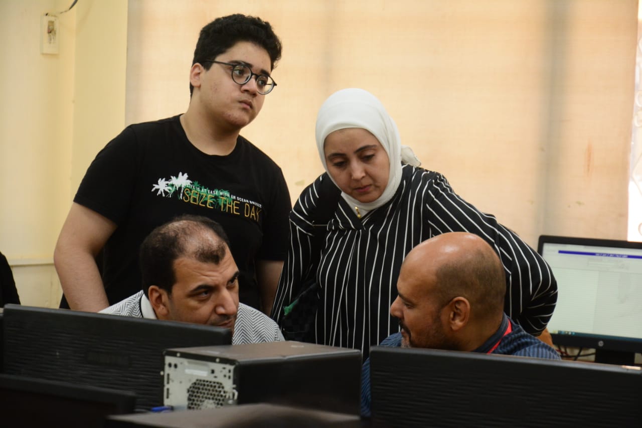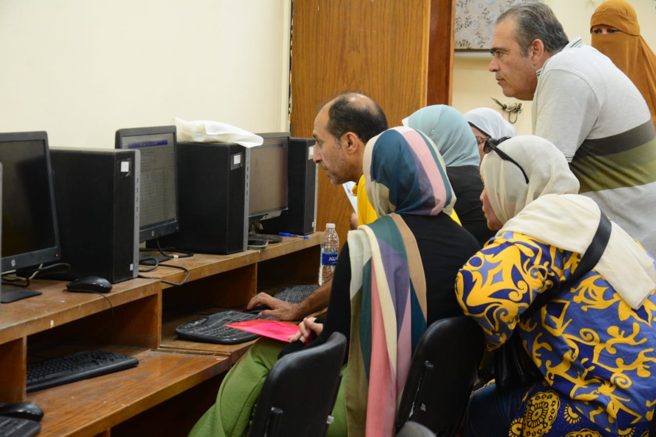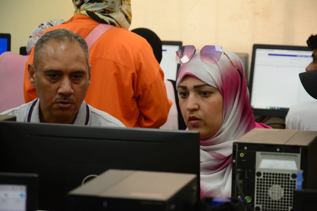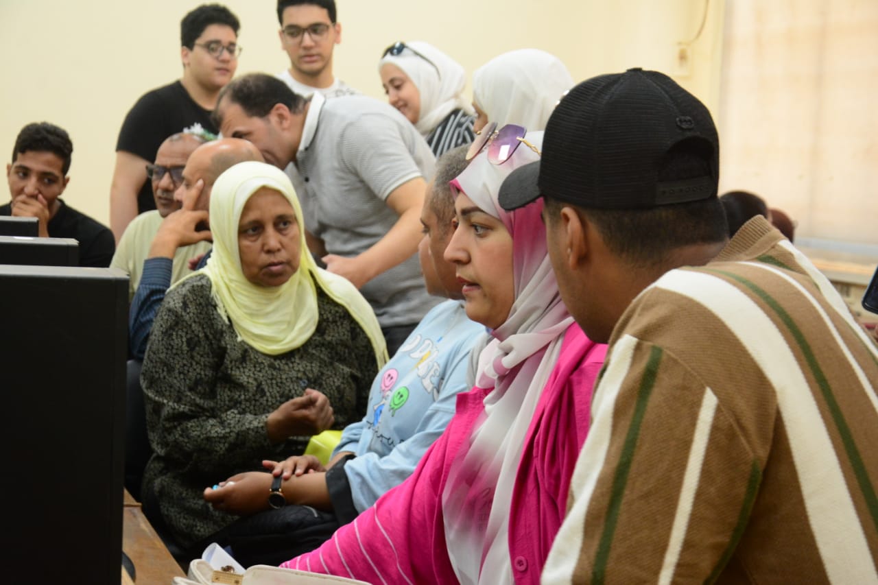 وحرص أولياء الأمور على مساندة أبنائهم من طلاب الثانوية العامة أثناء تسجيل الرغبات بتنسيق الجامعات داخل معمل كلية آداب جامعة عين شمس، ومشاركتهم في اختيار الكليات.
