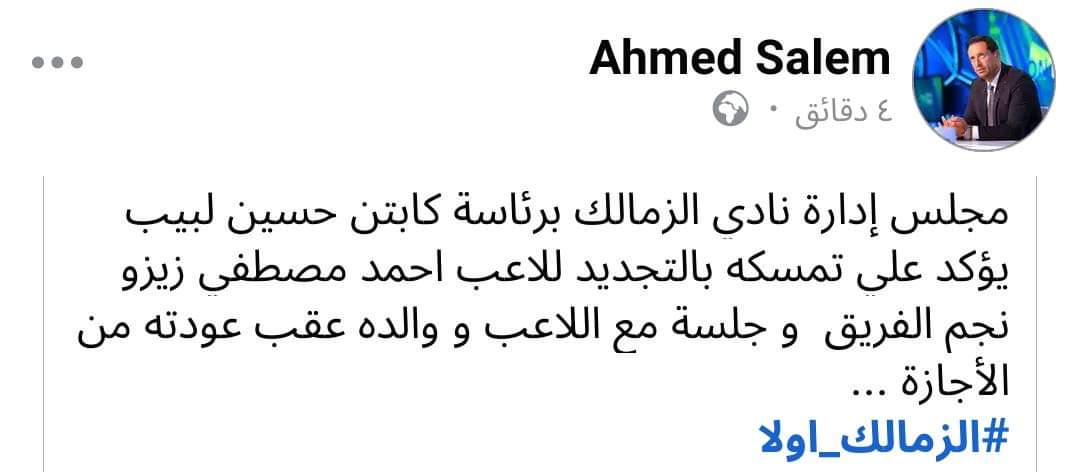 أعلن مجلس إدارة نادي الزمالك برئاسة حسين لبيب تمسكه بتجديد عقد لاعب الفريق الكروي بالنادي أحمد سيد زيزو بعد توقف مفاوضات انتقاله إلى نيوم السعودي بالميركاتو الصيفي الجاري.