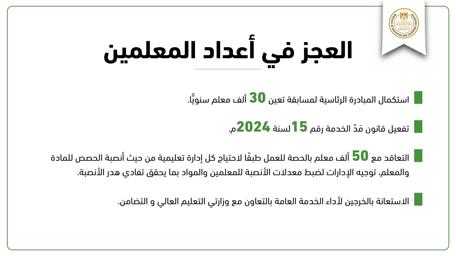 وأضاف الوزير أن الوزارة تعمل على تفعيل قانون مد الخدمة، وهو القانون 15 لسنة 2024 من أجل الاستفادة من خبرة المعلمين الذين بلغوا سن المعاش، ولديهم من الخبرة والقدرة ما يجعلهم يستمروا لسنوات أخرى.