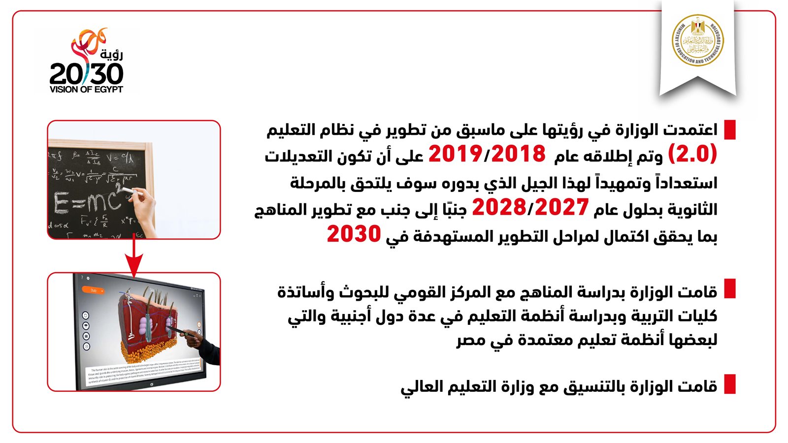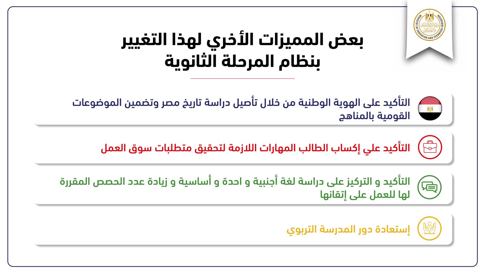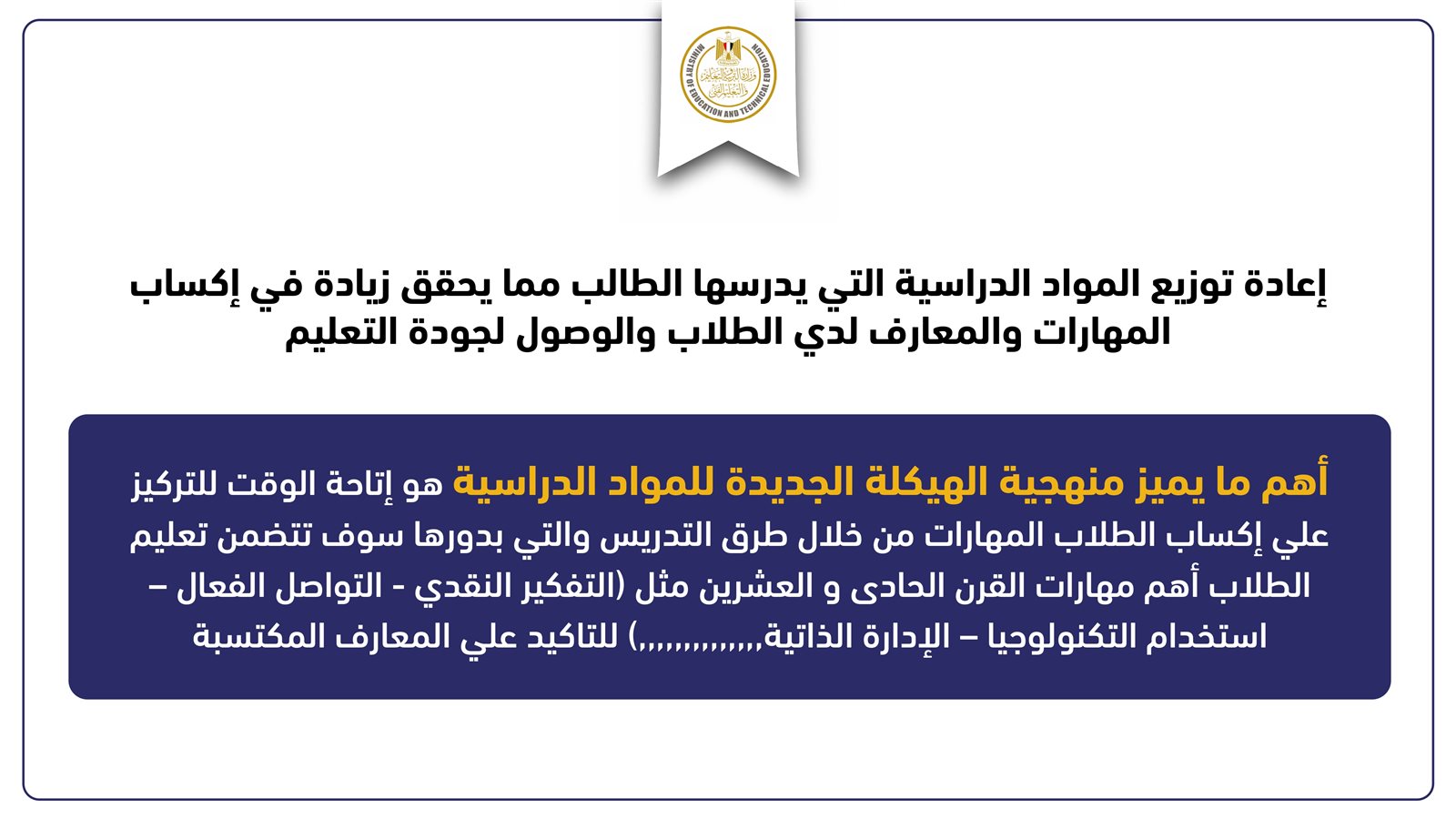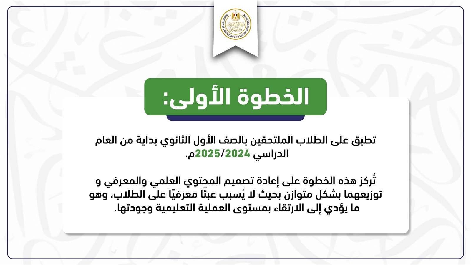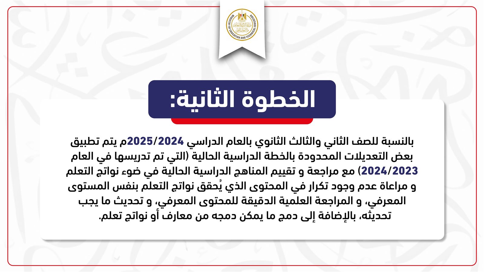 كما كشف وزير التربية والتعليم والتعليم الفني عن إعادة تصميم المحتوى العلمي والمعرفي لصفوف المرحلة الثانوية وتوزيعها بشكل متوازن، بحيث لا تسبب عبئًا معرفيًا على الطلاب.