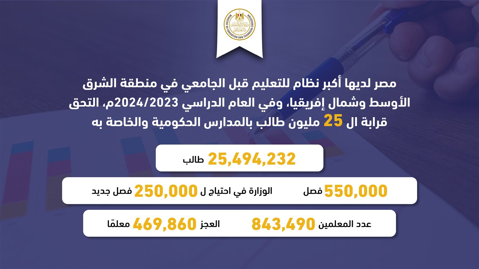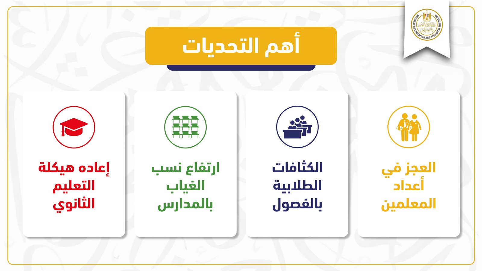 كما كشف محمد عبد اللطيف وزير التربية والتعليم والتعليم الفني عن خطة الوزارة لمواجهة العجز في المعلمين، مشيرًا إلى أنه على الرغم من أن العدد الحالي للمعلمين يبلغ 843490 معلم موزعين على المدارس المصرية، إلا أن العجز بلغ 469860 معلمًا يشكلون تحديًا كبيرًا أمام وزارة التربية والتعليم.