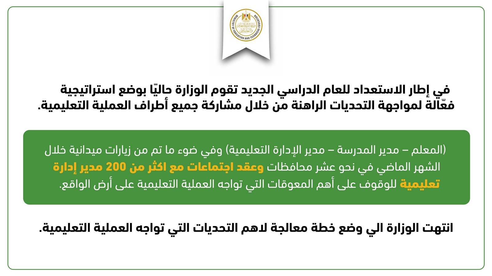 وأكد وزير التربية والتعليم، خلال المؤتمر الصحفي الذي عقد بمجلس الوزراء بحضور الدكتور مصطفى مدبولي رئيس مجلس الوزراء، أن زياراته الميدانية لأكثر من 10 محافظات، والحوار الذي أداره مع العديد من مديري المديريات والإدارات التعليمية جعل التحرك لأجل مواجهة هذا التحدي في أسرع وقت من أولويات الوزارة في الفترة المقبلة.