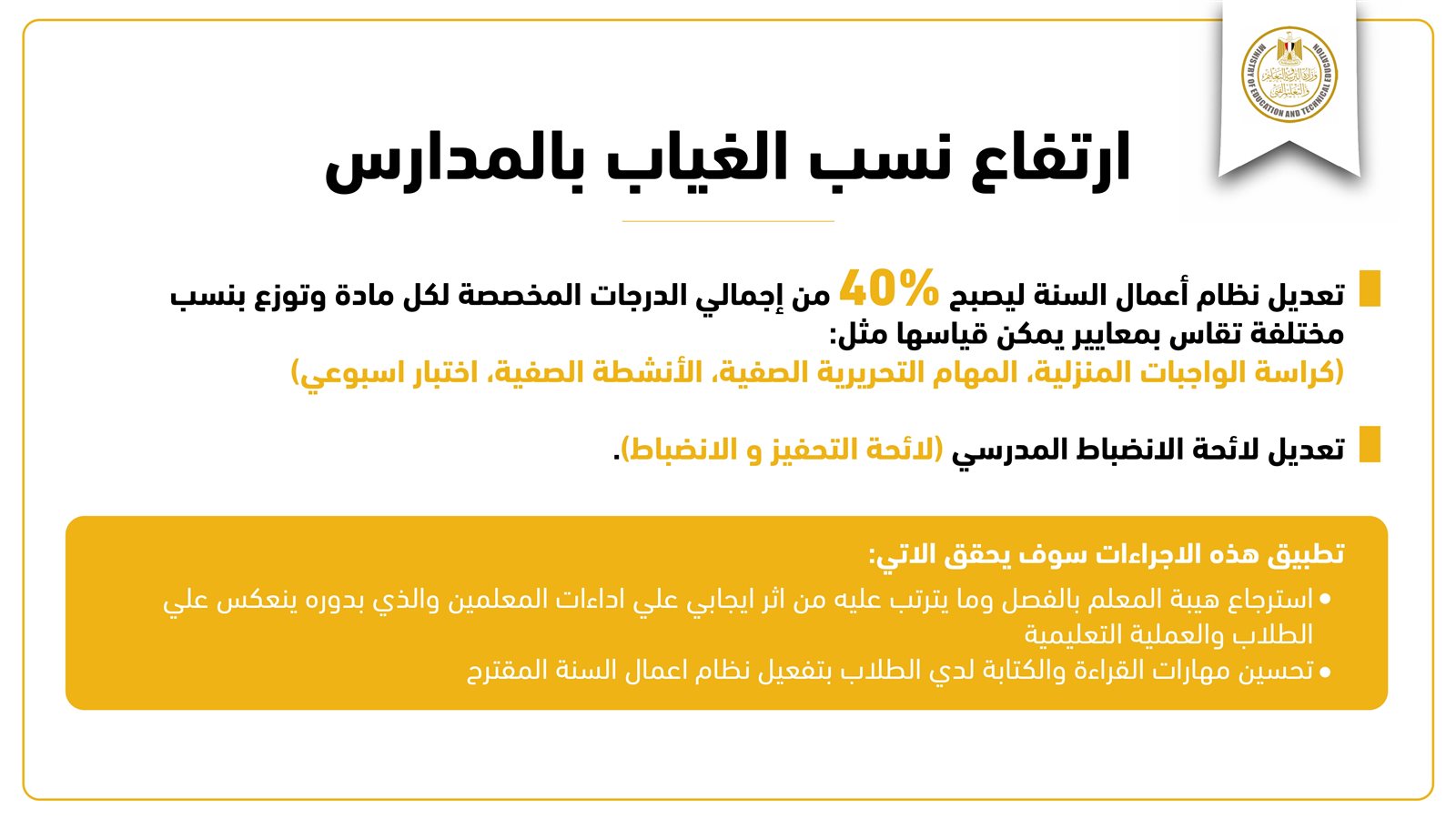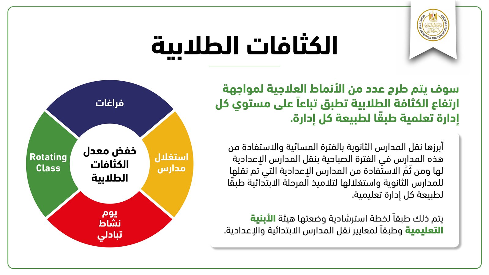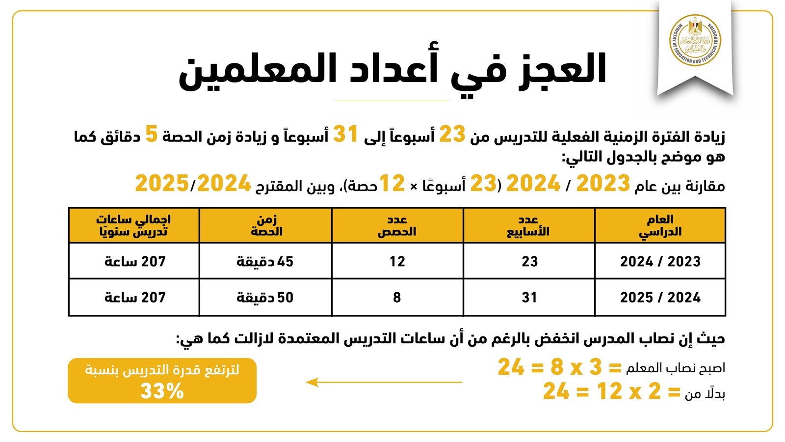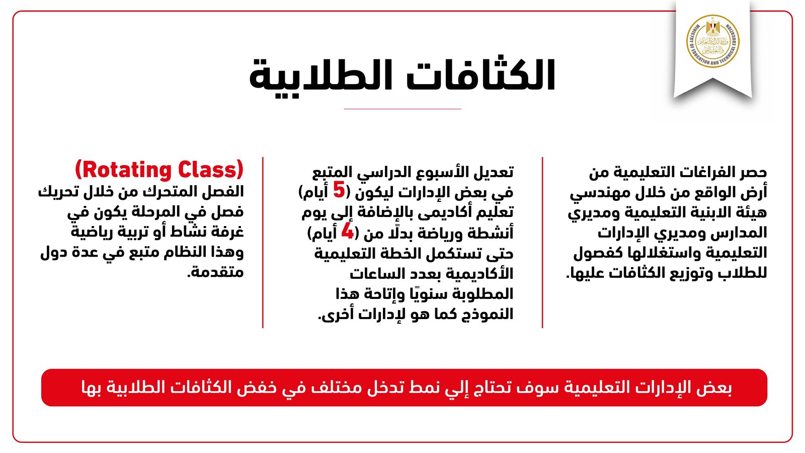 وكشف الوزير عن الاستعانة بالخريجين لأداء الخدمة العامة بالتعاون مع وزارتي التعليم العالي والتضامن الاجتماعي، مع زيادة الفترة الزمنية الفعلية للتدريس من 23 أسبوعا إلى 31 أسبوعا، إضافة لزيادة الحصص بمقدار 5 دقائق، وهو ما يرفع من قدرة التدريس بنسبة 33 %.