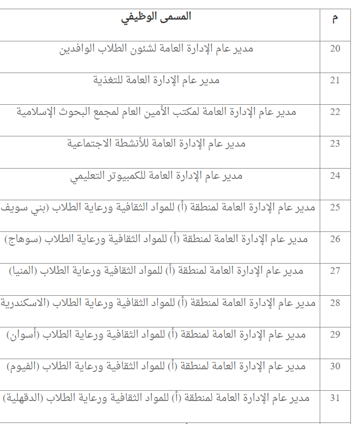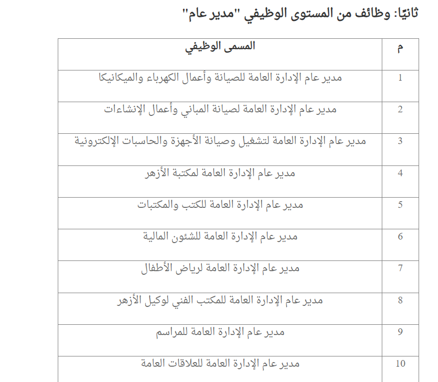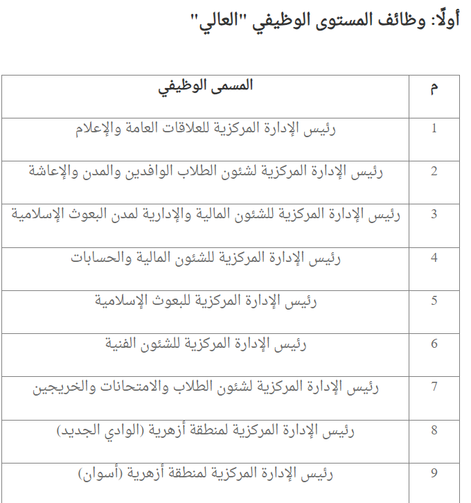 أعلن الأزهر الشريف حاجته لشغل بعض الوظائف القيادية بالمستوى الوظيفي (العالي – مدير عام) ببعض قطاعاته، وَفْقًا لأحكام قانون الخدمة المدنية الصادر بالقانون رقم (81) لسنة 2016 م ولائحته التنفيذية.