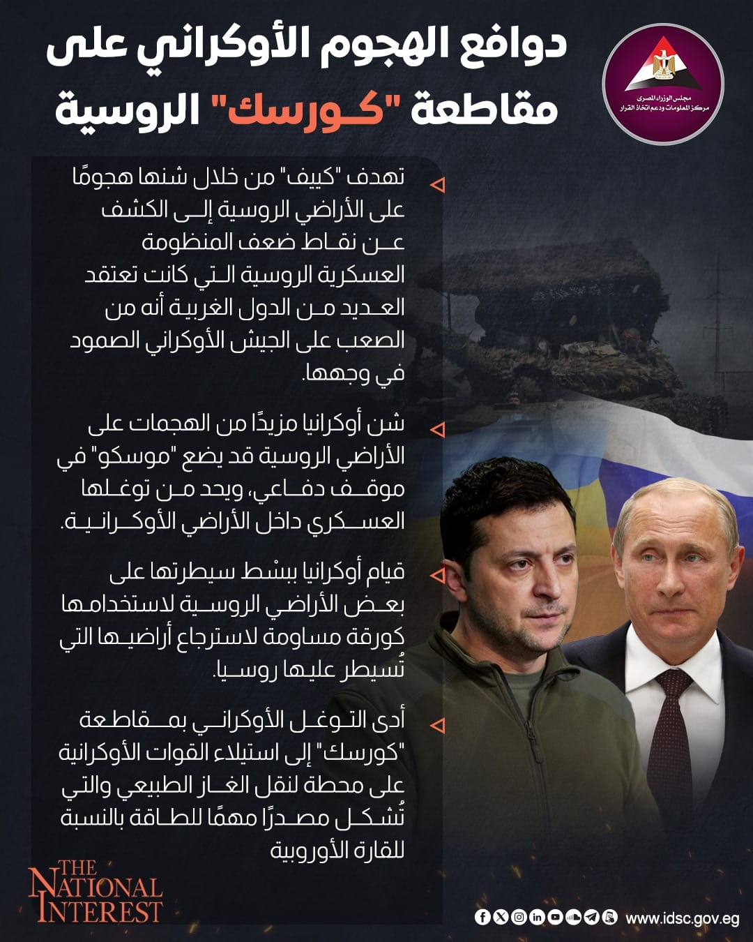 سلَّط مركز معلومات مجلس الوزراء الضوء على مقال نشرته مجلة "ذا ناشيونال إنترست" الضوء على شن الجيش الأوكراني هجومًا على مقاطعة "كورسك" الروسية الحدودية مع أوكرانيا.