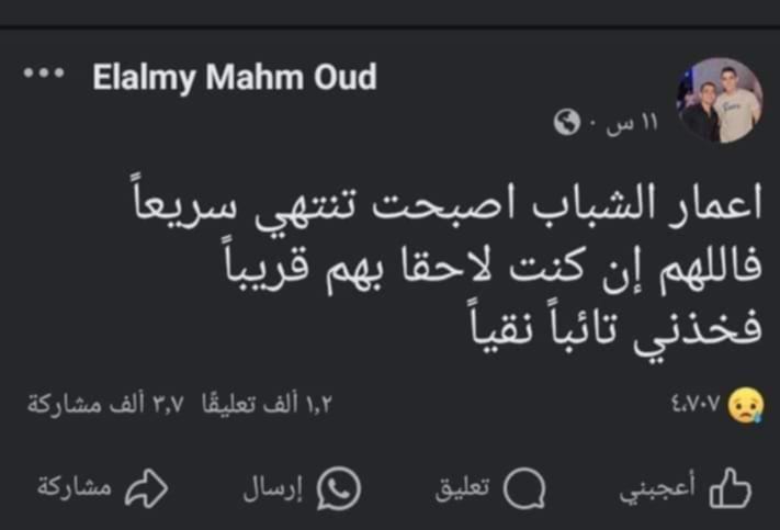 وكان رواد مواقع التواصل الاجتماعي قد تداولوا منشورًا كتبه الشاب عبر حسابه الشخصي على موقع فيس بوك، حيث قال: "أعمار الشباب أصبحت تنتهي سريعًا... فاللهم إن كنت لاحقًا بهم قريبًا فخذني تائبًا نقيًا". ولم تمر سوى ساعات قليلة حتى تعرض لحادث سير على طريق سمالوط شمال محافظة المنيا، مما أسفر عن وفاته، ليترك وراءه حالة من الحزن العميق بين أهله وأصدقائه.