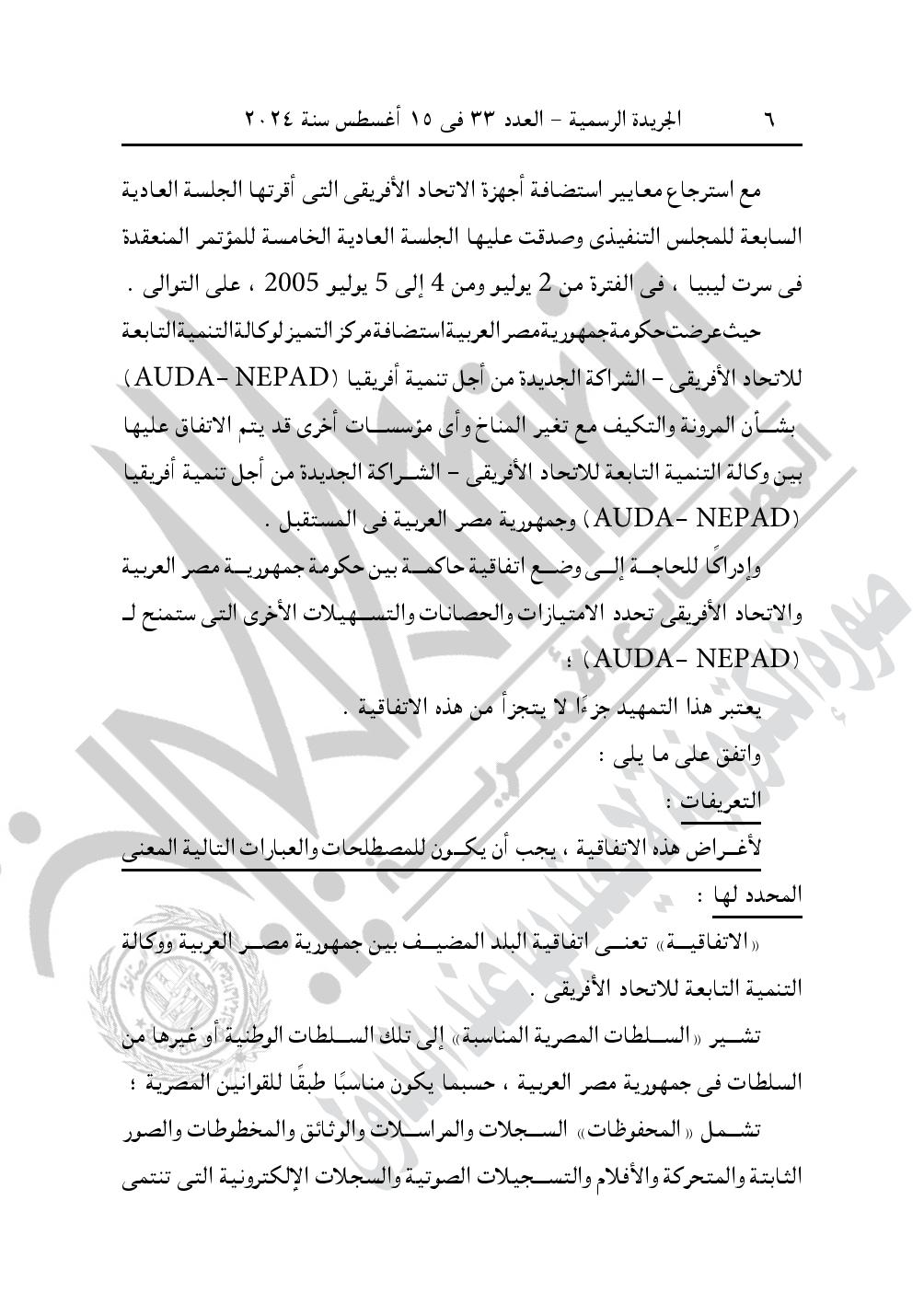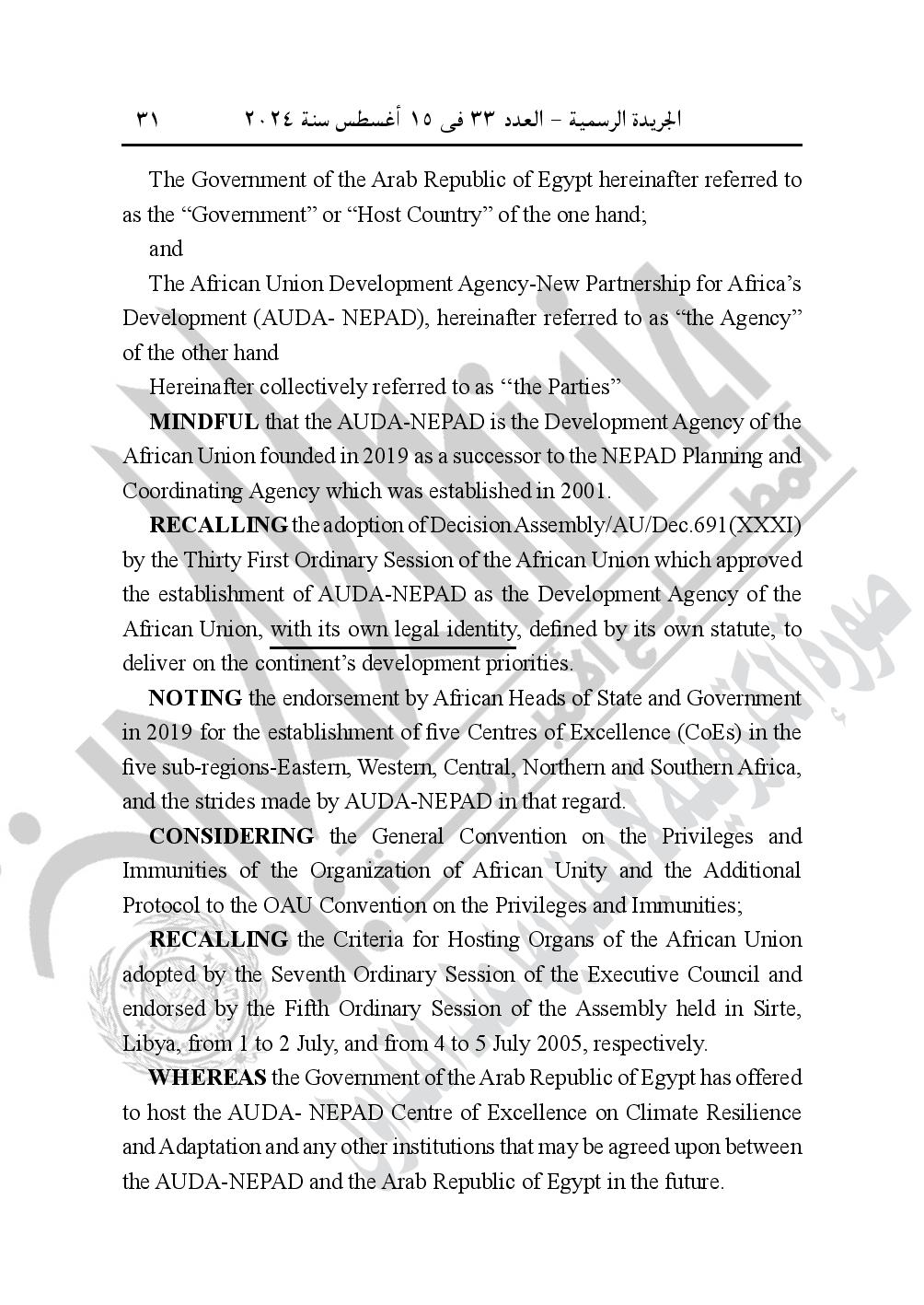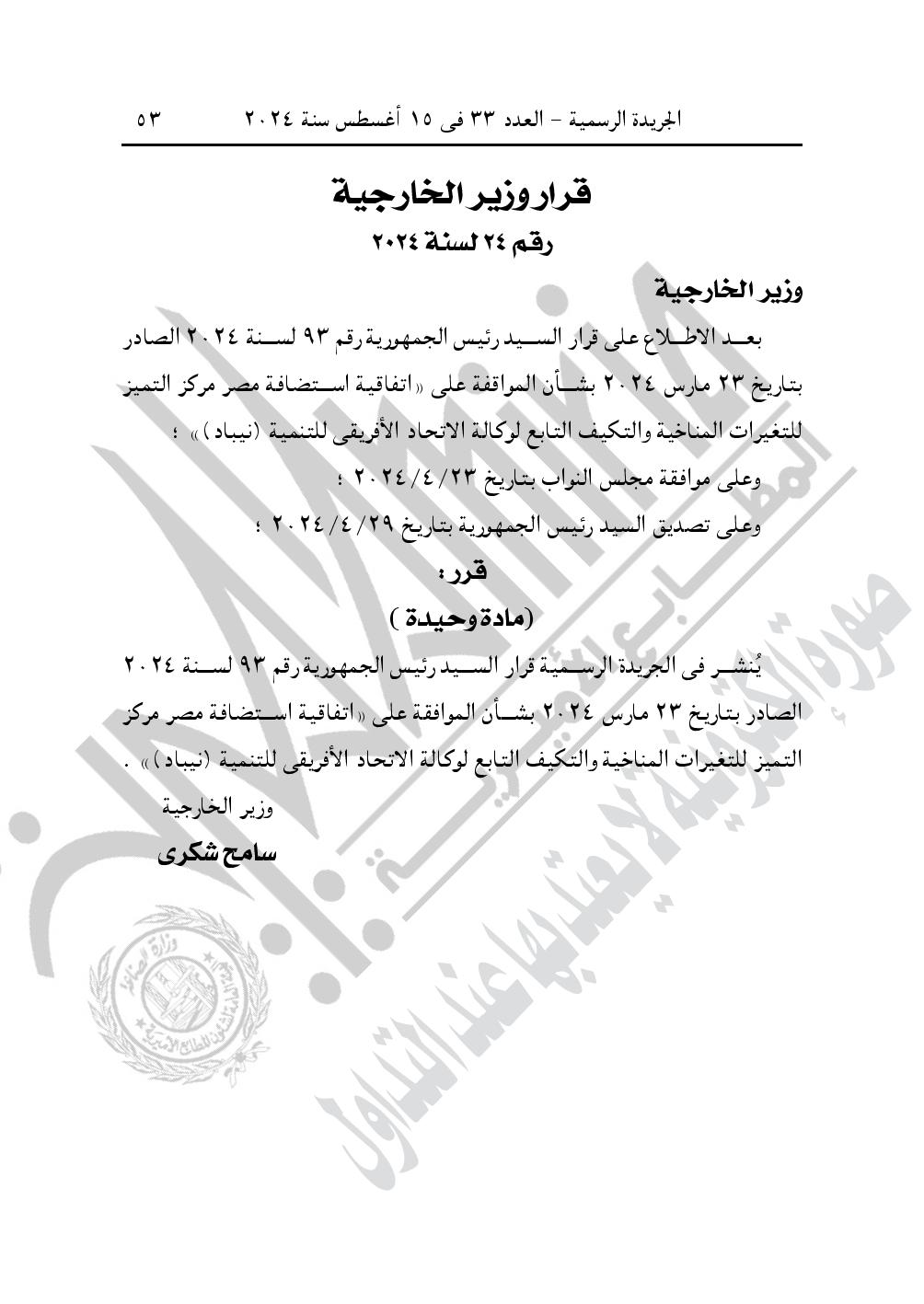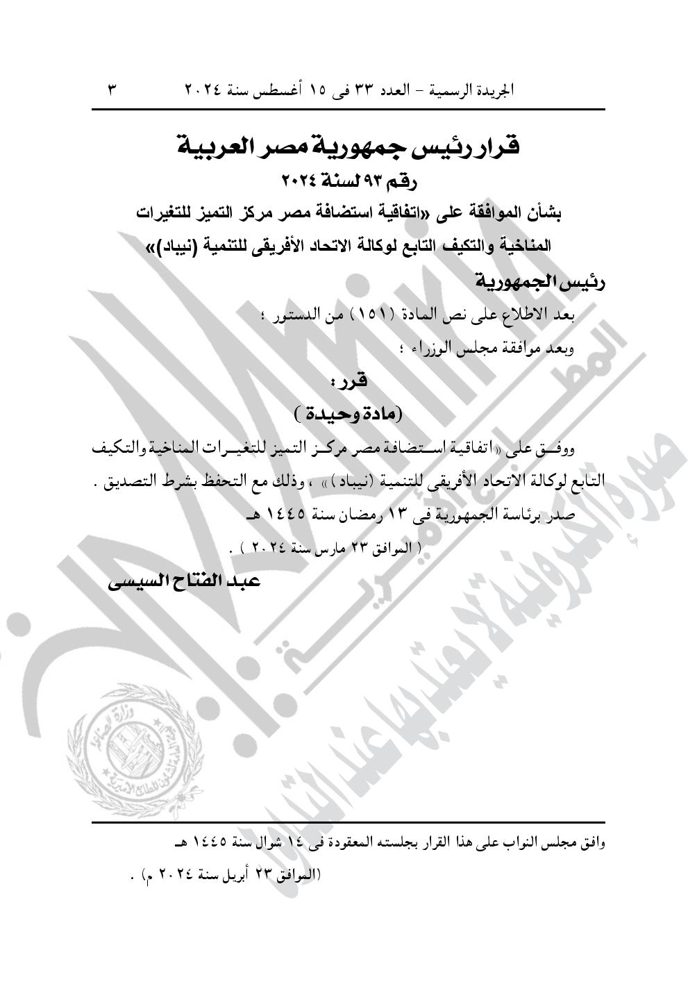 نشرت الجريدة الرسمية في عددها رقم 33، الصادر في 15 أغسطس 2024، قرارا جمهوريا جديدا اليوم للرئيس عبد الفتاح السيسي، القرار رقم 93 لسنة 2024، بشأن بشأن الموافقة على اتفاقية استضافة مصر مركز التميز للتغيرات المناخية والتكيف التابع لوكالة الاتحاد الأفريقي للتنمية (نيباد).