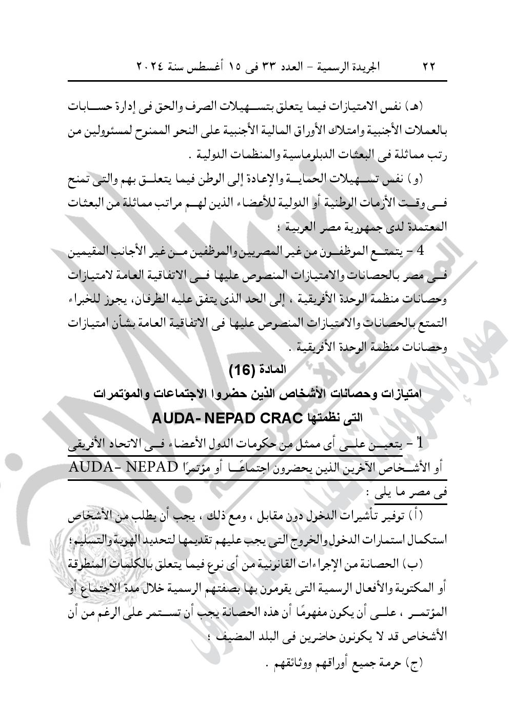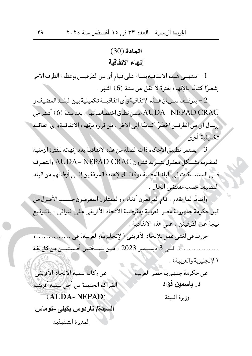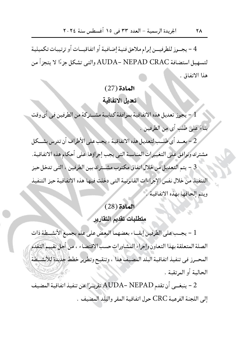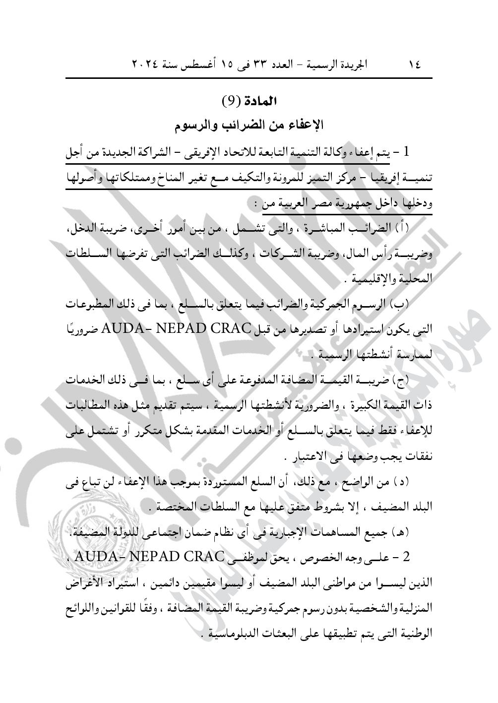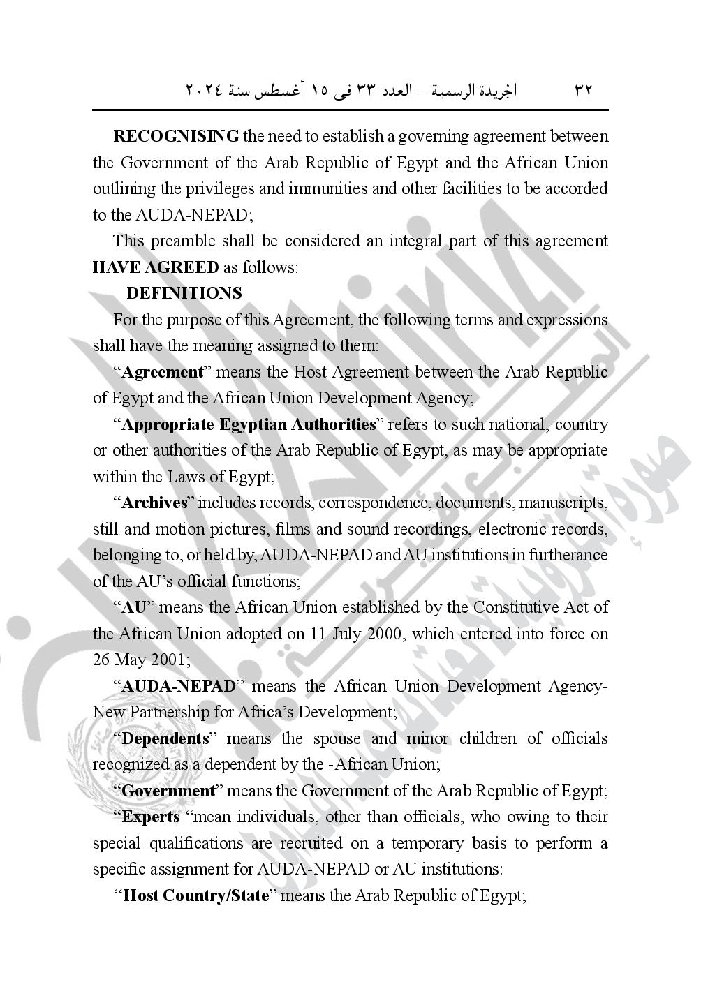 نشرت الجريدة الرسمية في عددها رقم 33، الصادر في 15 أغسطس 2024، قرارا جمهوريا جديدا اليوم للرئيس عبد الفتاح السيسي، القرار رقم 93 لسنة 2024، بشأن بشأن الموافقة على اتفاقية استضافة مصر مركز التميز للتغيرات المناخية والتكيف التابع لوكالة الاتحاد الأفريقي للتنمية (نيباد).