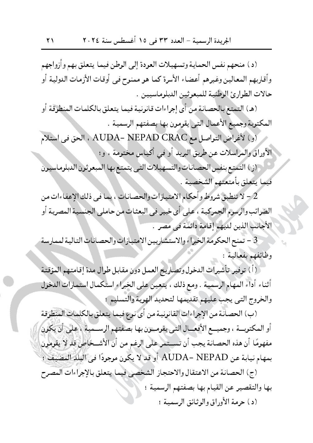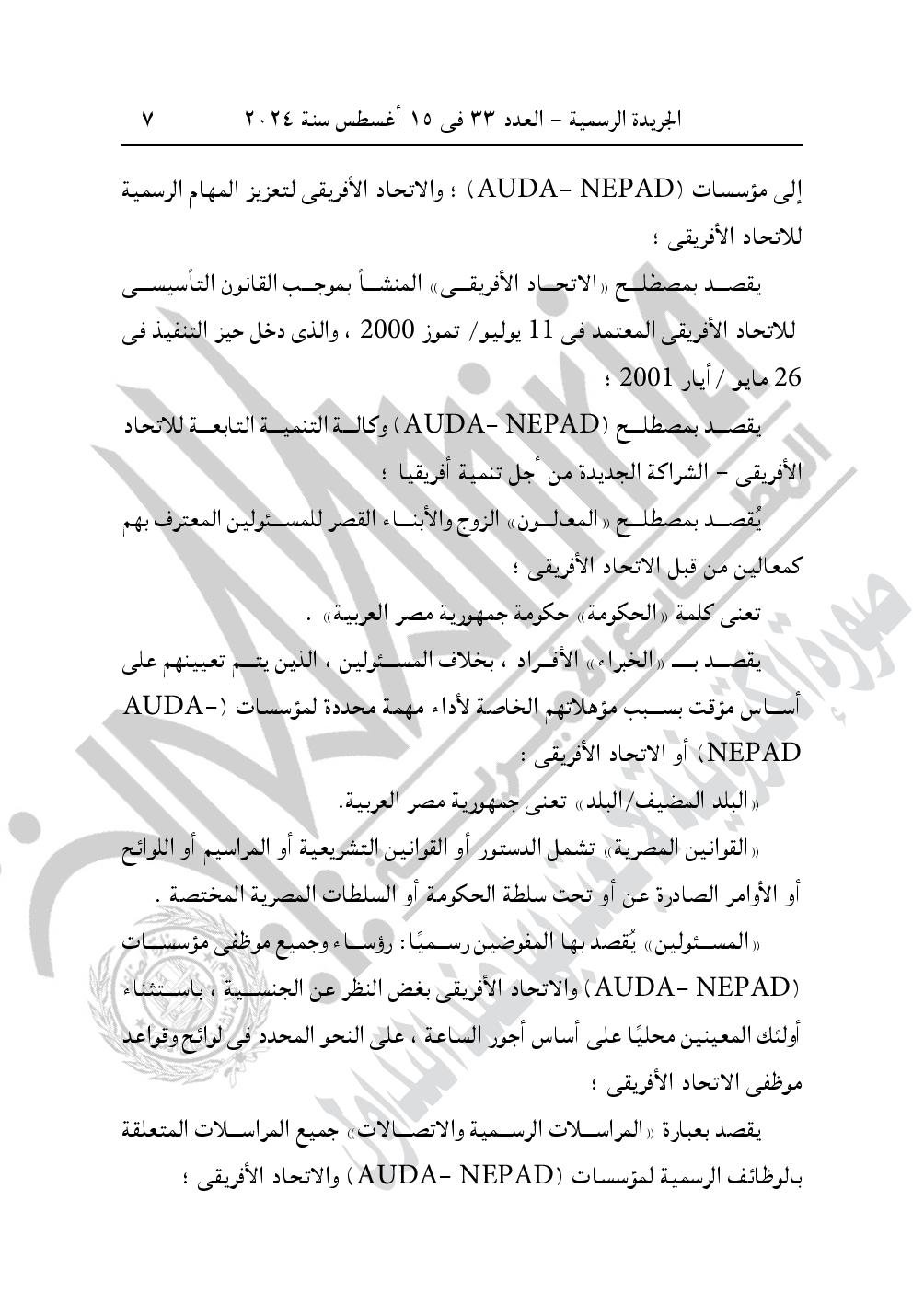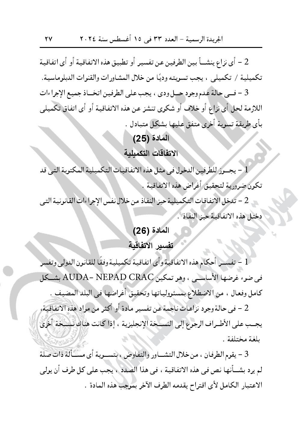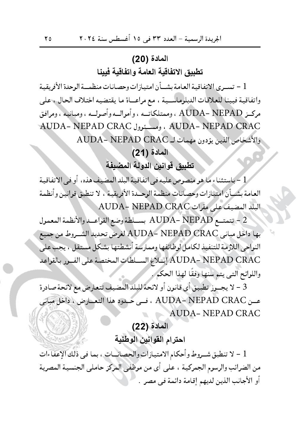 نشرت الجريدة الرسمية في عددها رقم 33، الصادر في 15 أغسطس 2024، قرارا جمهوريا جديدا اليوم للرئيس عبد الفتاح السيسي، القرار رقم 93 لسنة 2024، بشأن بشأن الموافقة على اتفاقية استضافة مصر مركز التميز للتغيرات المناخية والتكيف التابع لوكالة الاتحاد الأفريقي للتنمية (نيباد).