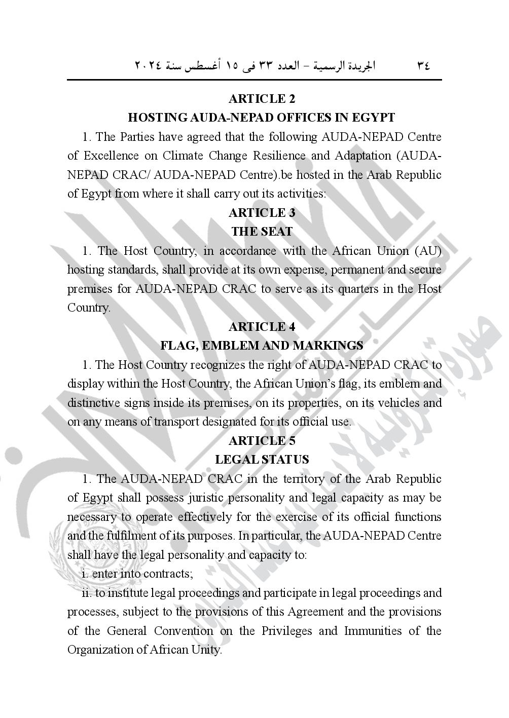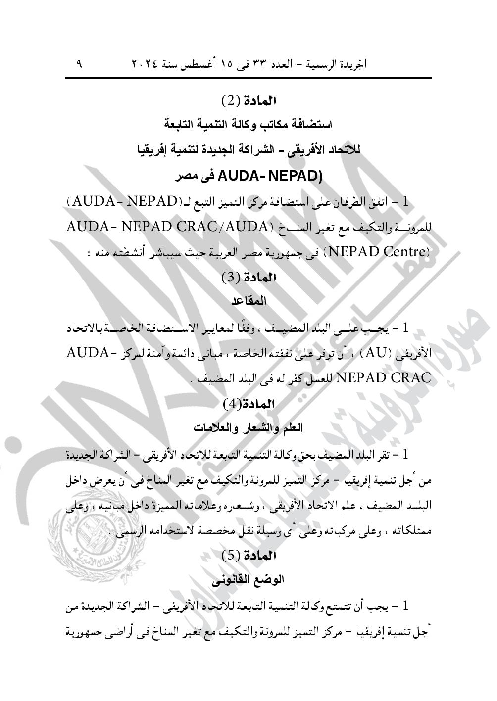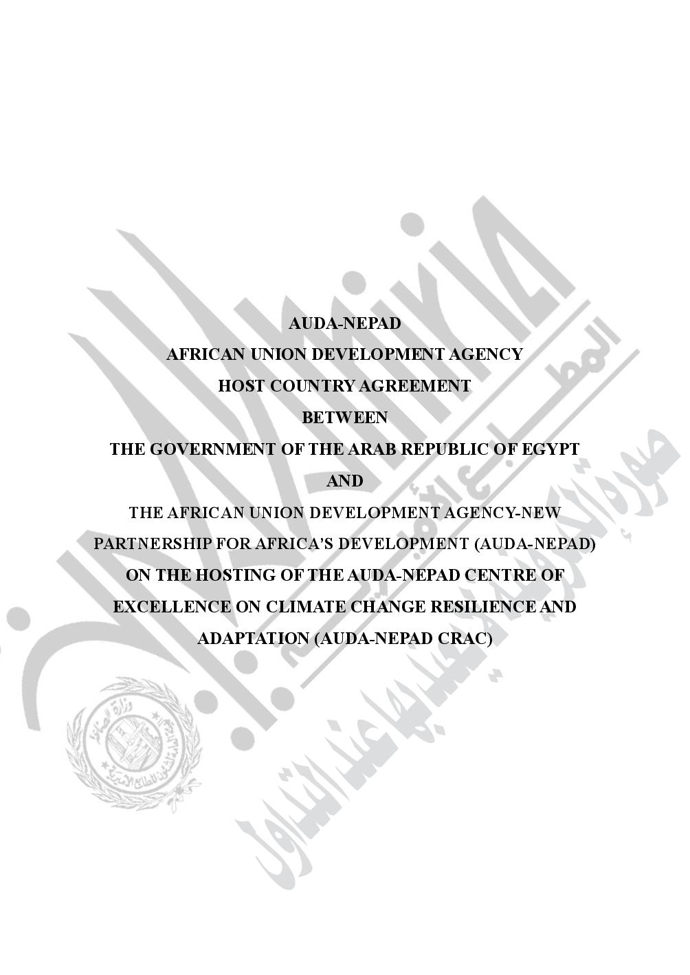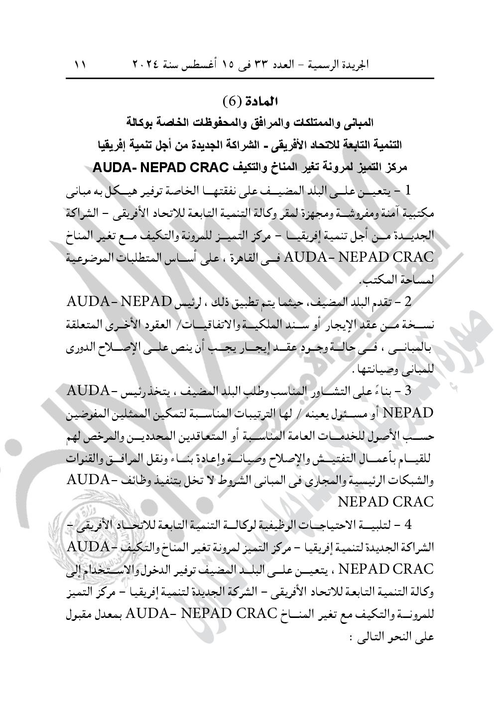 ونصت المادة الوحيدة للقرار الجمهوري الجديد على "الموافقة على اتفاقية استضافة مصر مركز التميز للتغيرات المناخية والتكيف التابع لوكالة الاتحاد الأفريقي للتنمية (نيباد )،وذلك مع التحفظ بشرط التصديق.