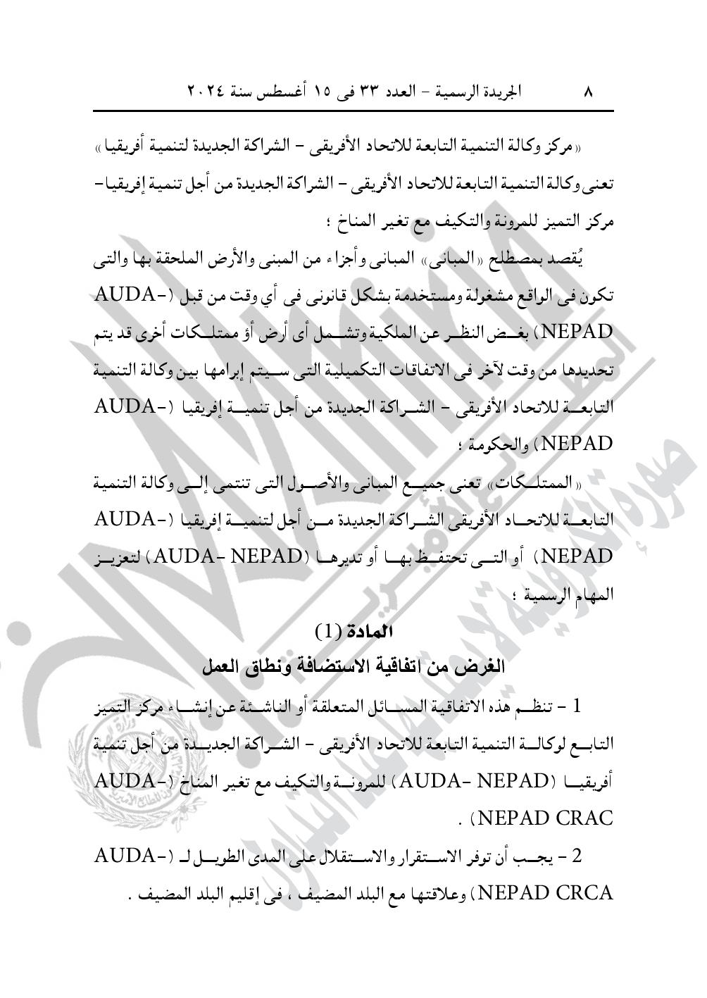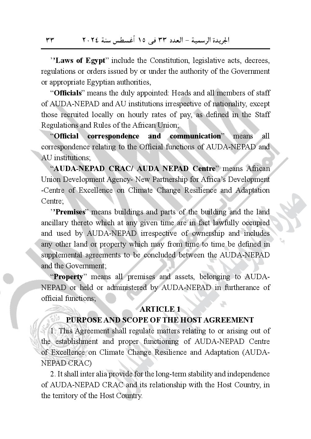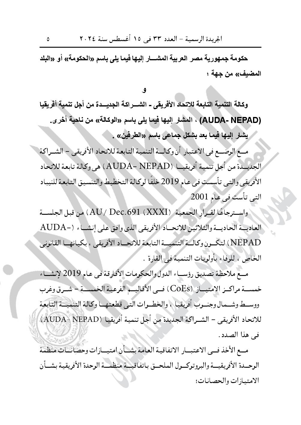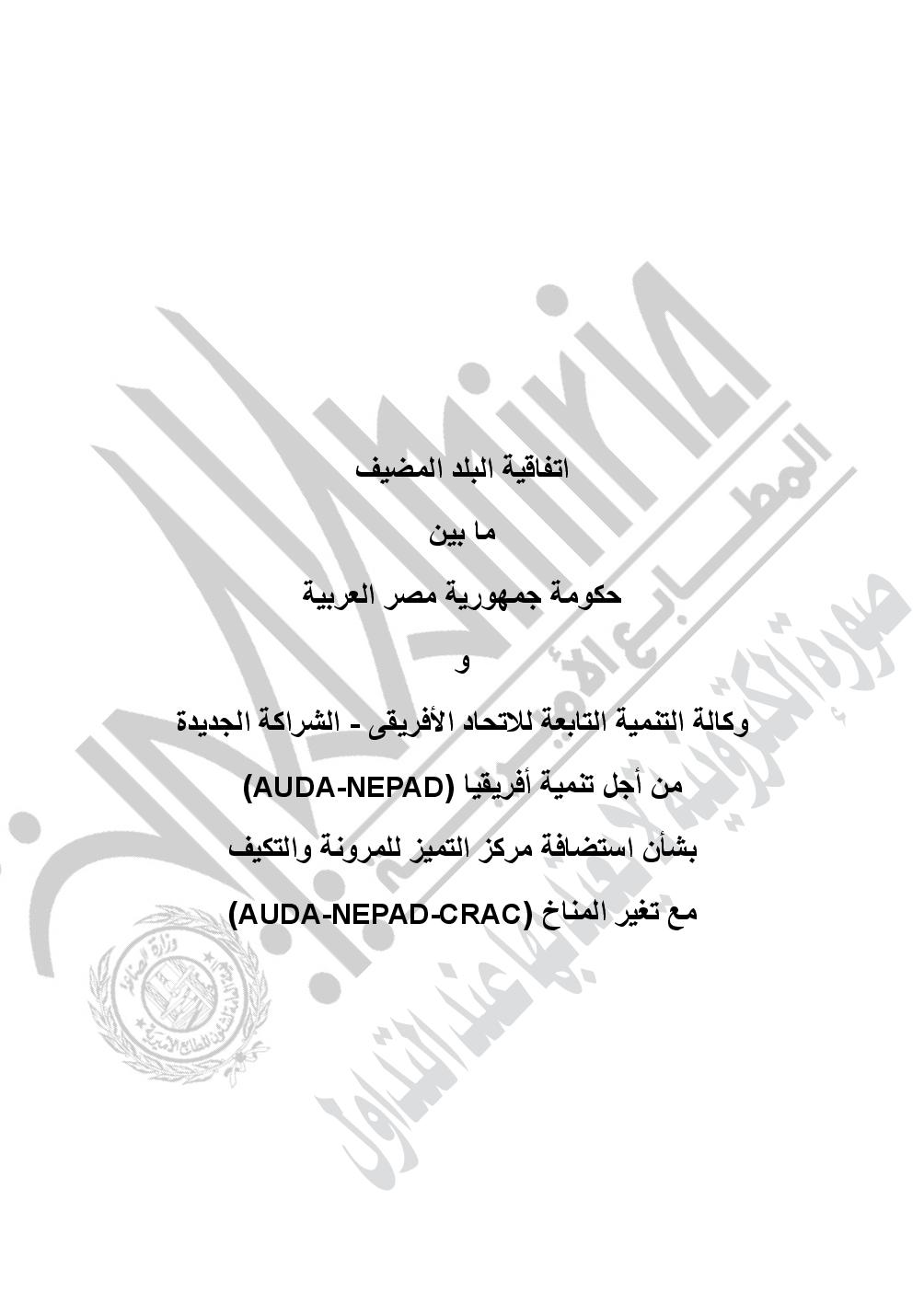 ونصت المادة الوحيدة للقرار الجمهوري الجديد على "الموافقة على اتفاقية استضافة مصر مركز التميز للتغيرات المناخية والتكيف التابع لوكالة الاتحاد الأفريقي للتنمية (نيباد )،وذلك مع التحفظ بشرط التصديق.