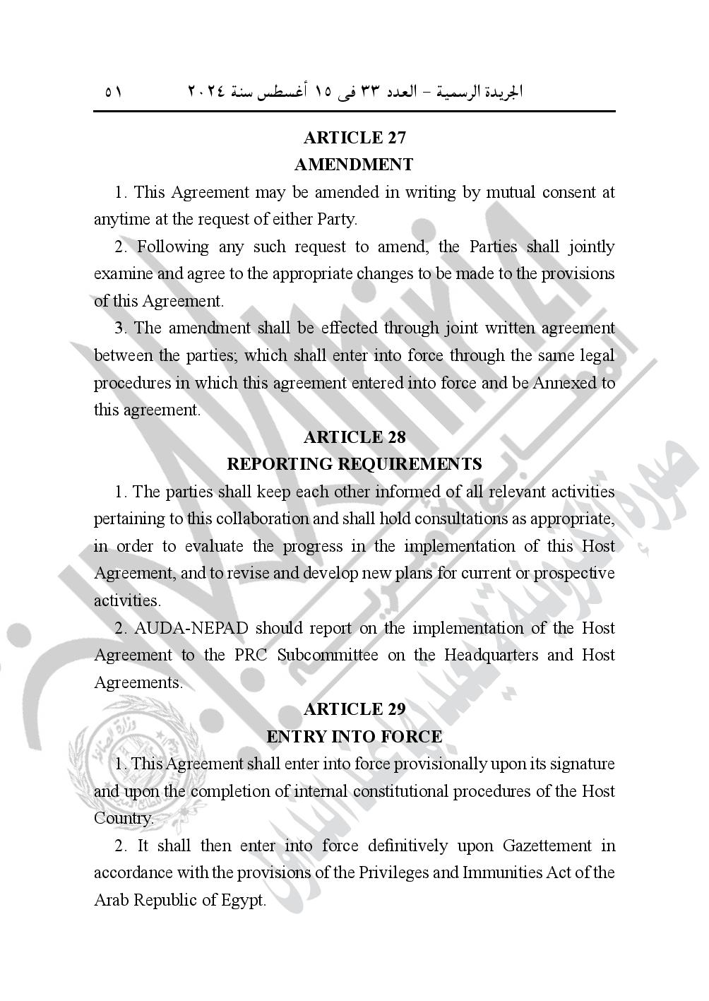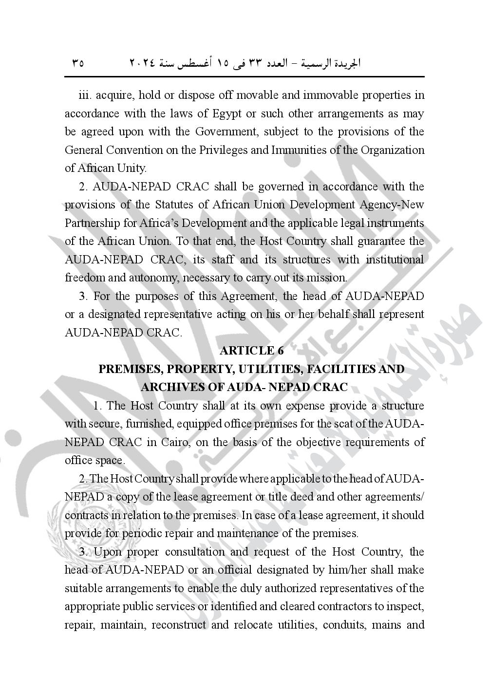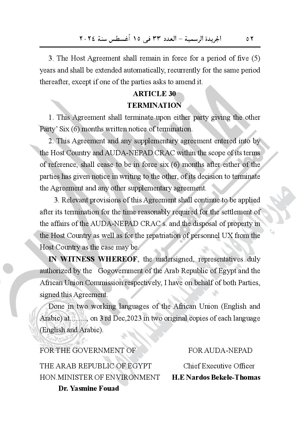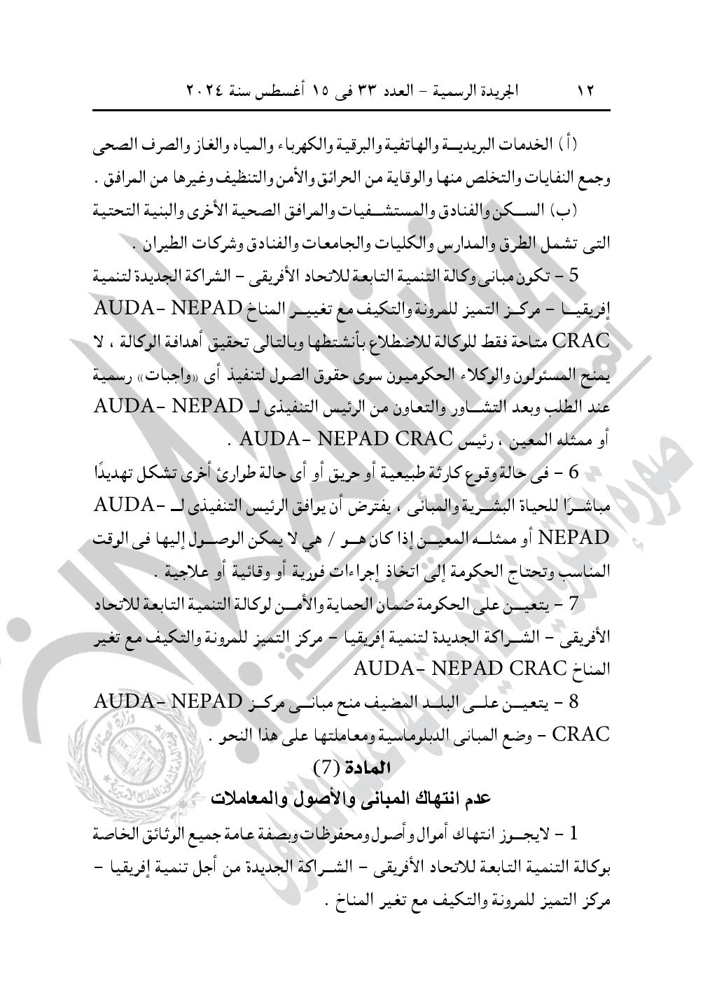 ونصت المادة الوحيدة للقرار الجمهوري الجديد على "الموافقة على اتفاقية استضافة مصر مركز التميز للتغيرات المناخية والتكيف التابع لوكالة الاتحاد الأفريقي للتنمية (نيباد )،وذلك مع التحفظ بشرط التصديق.
