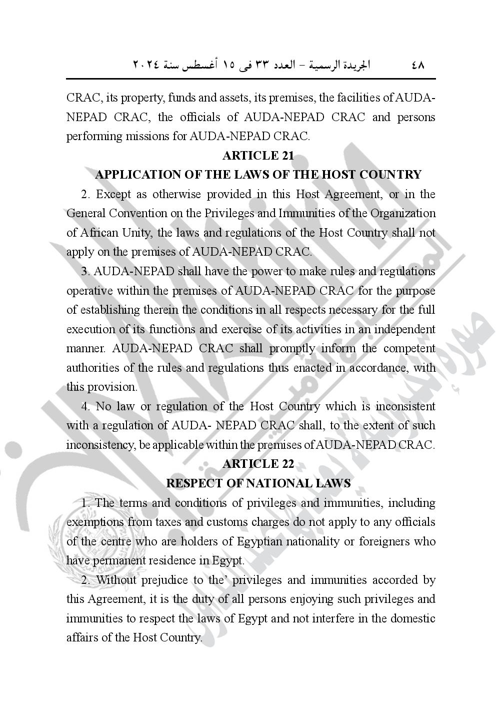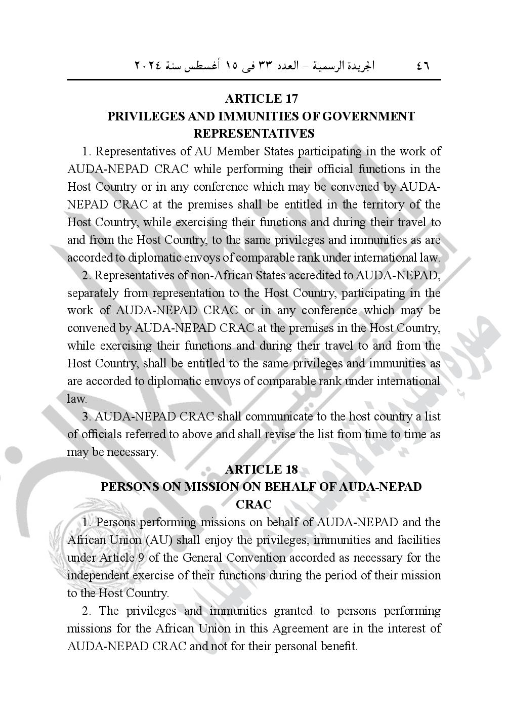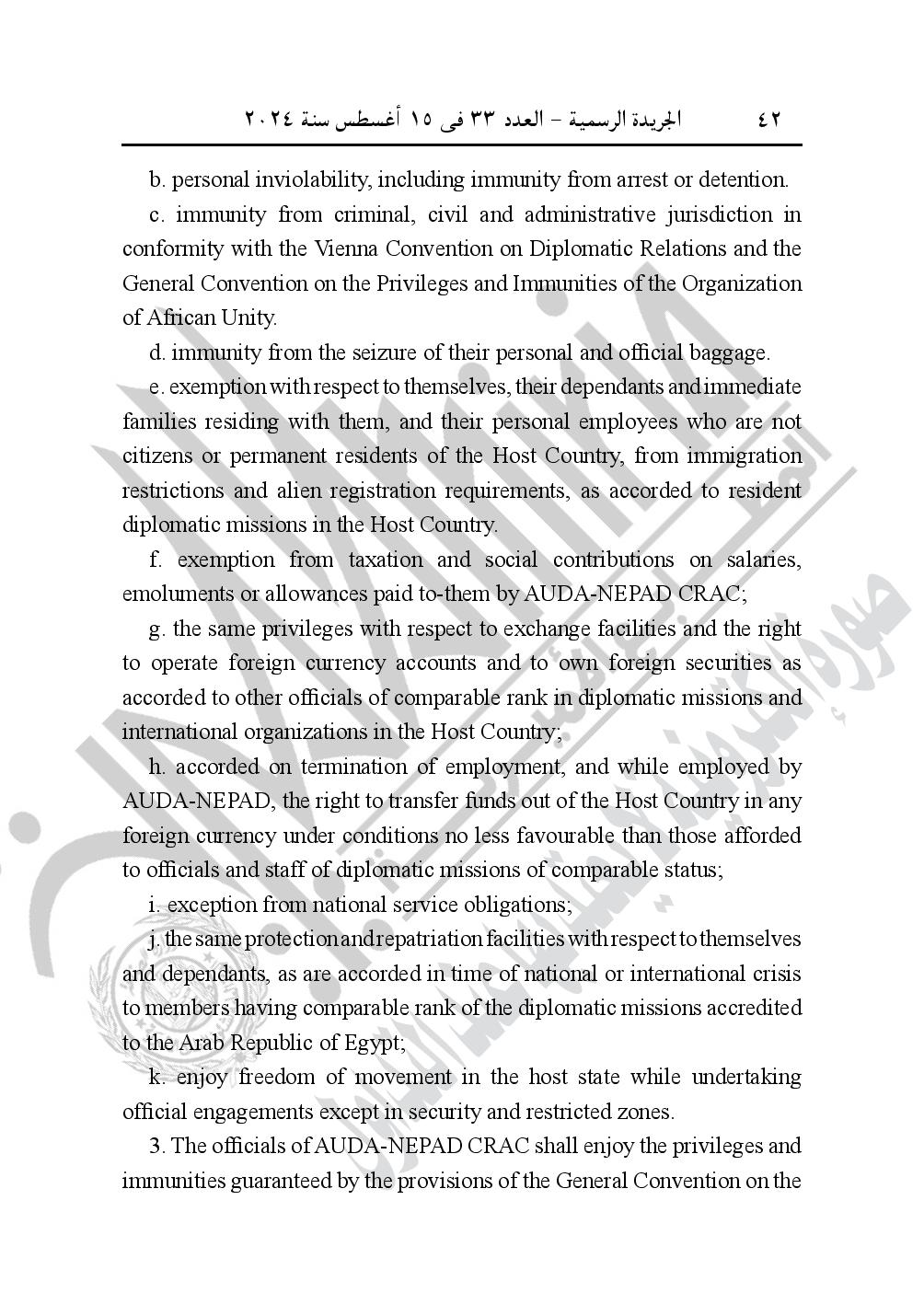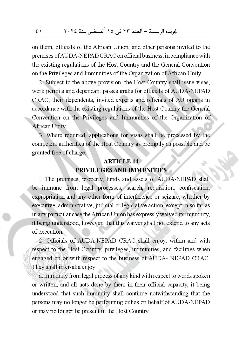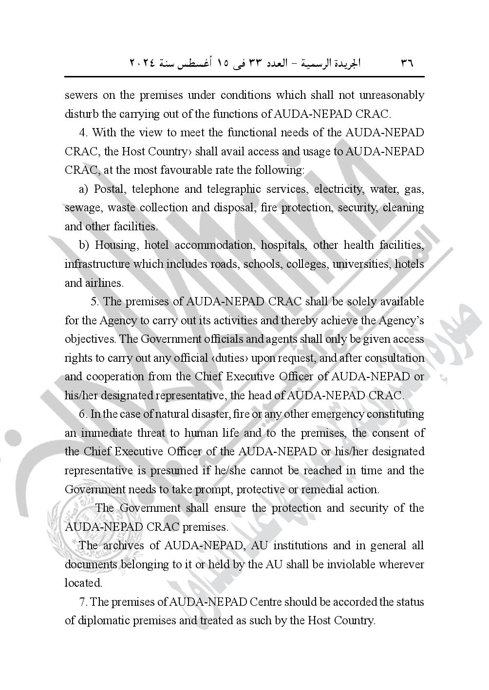 NEPAD CRCA) وعلاقتها مع البلد المضيف، في إقليم البلد المضيف.