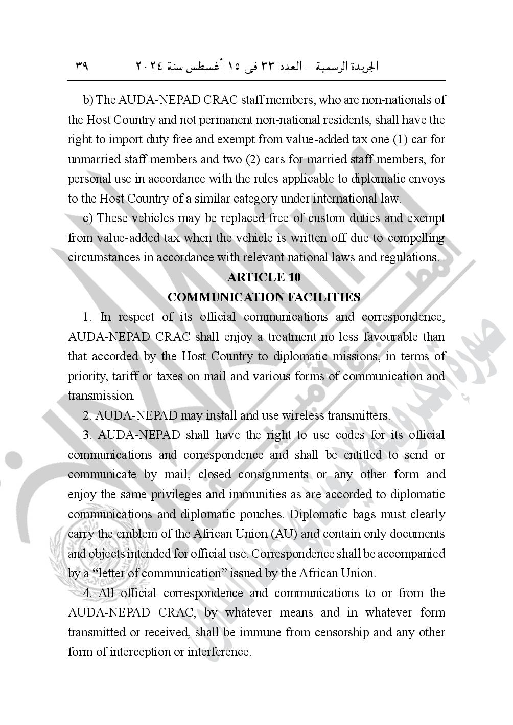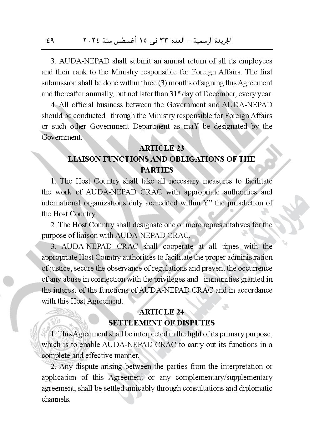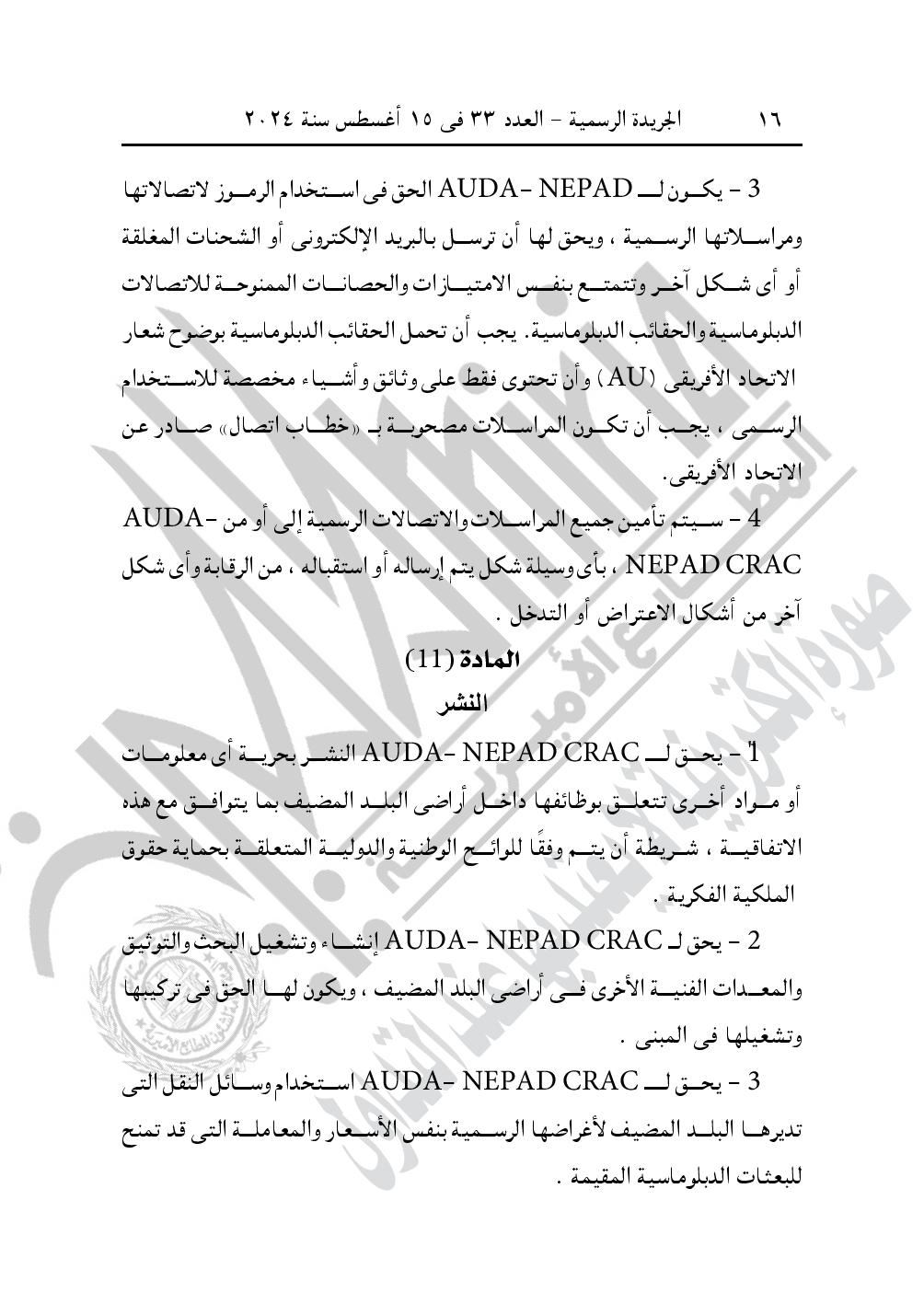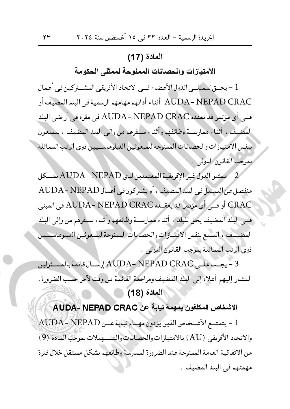 NEPAD CRCA) وعلاقتها مع البلد المضيف، في إقليم البلد المضيف.