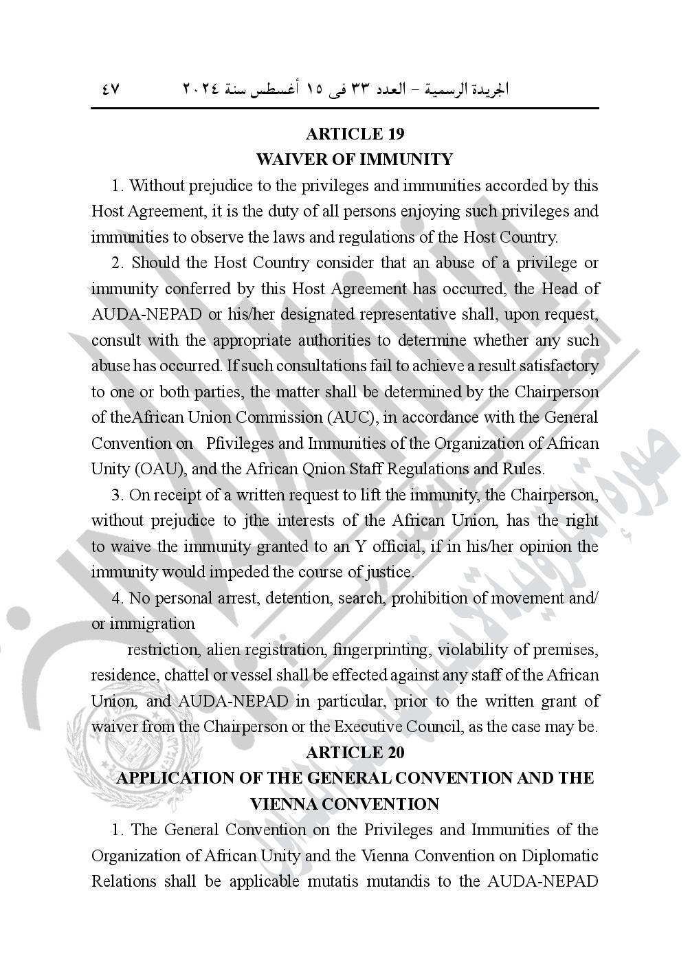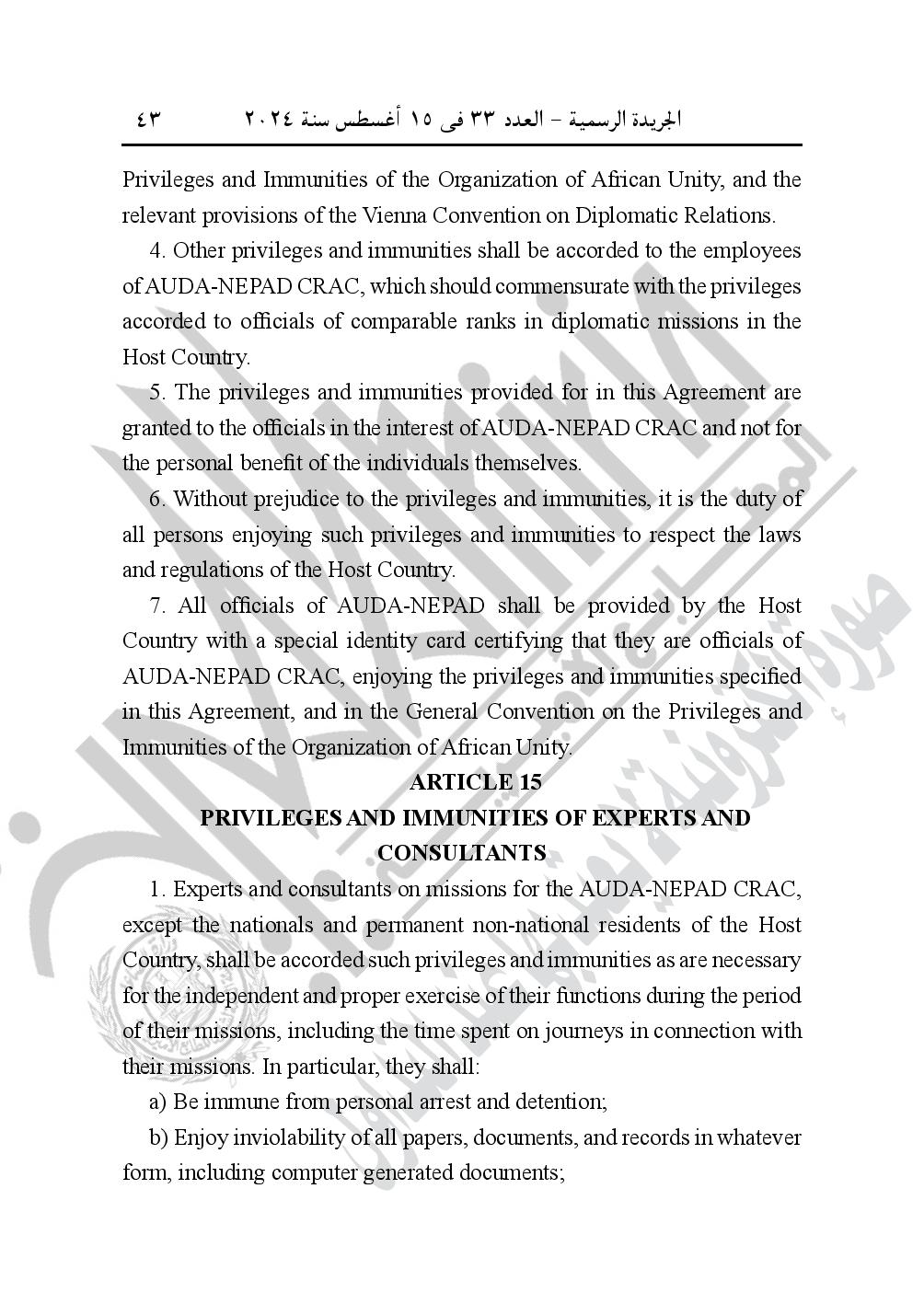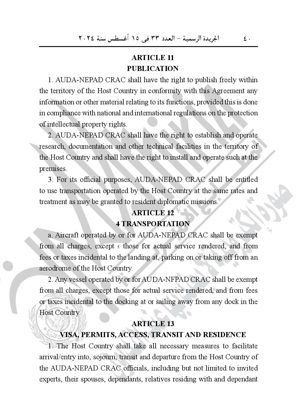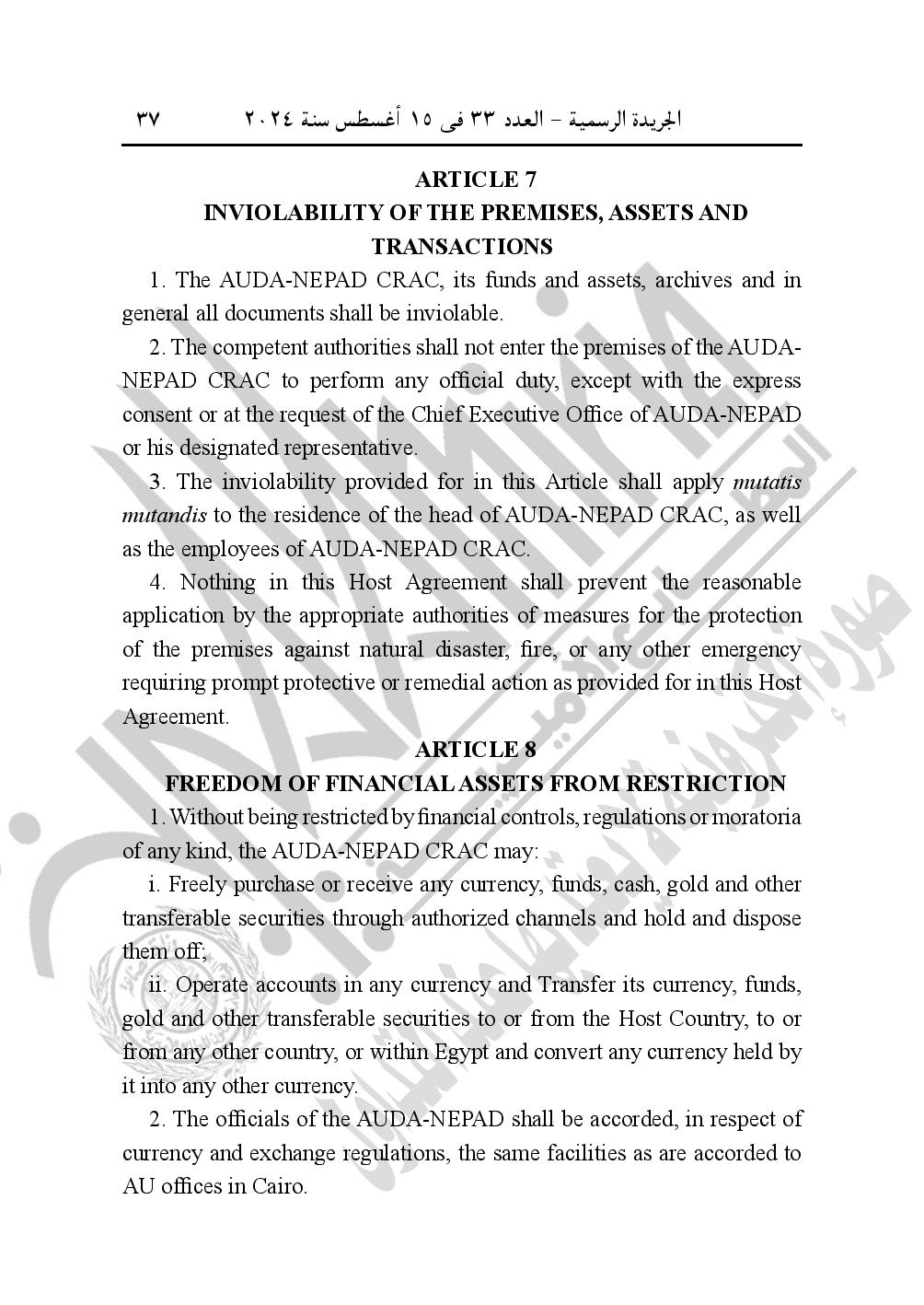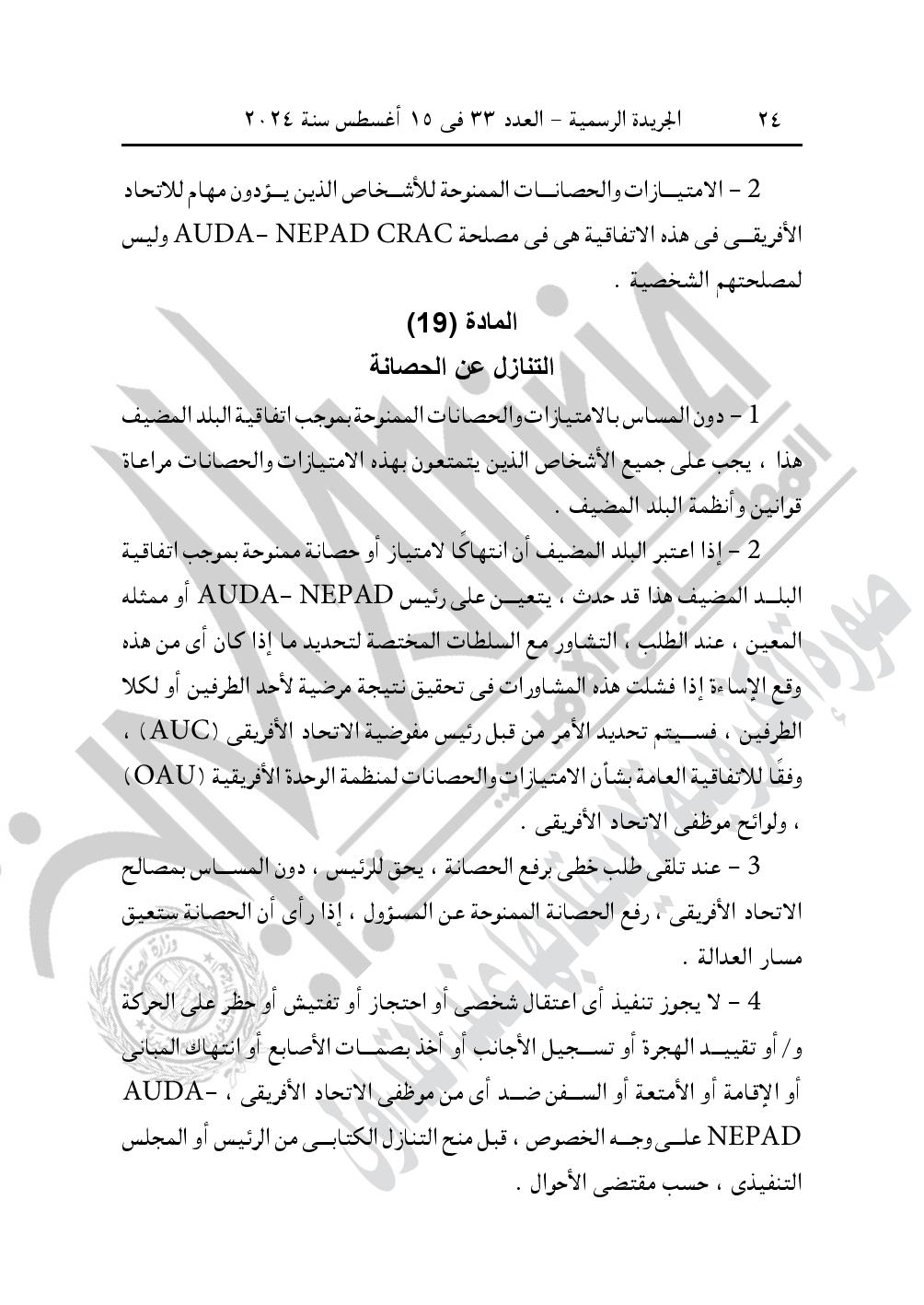 NEPAD CRCA) وعلاقتها مع البلد المضيف، في إقليم البلد المضيف.