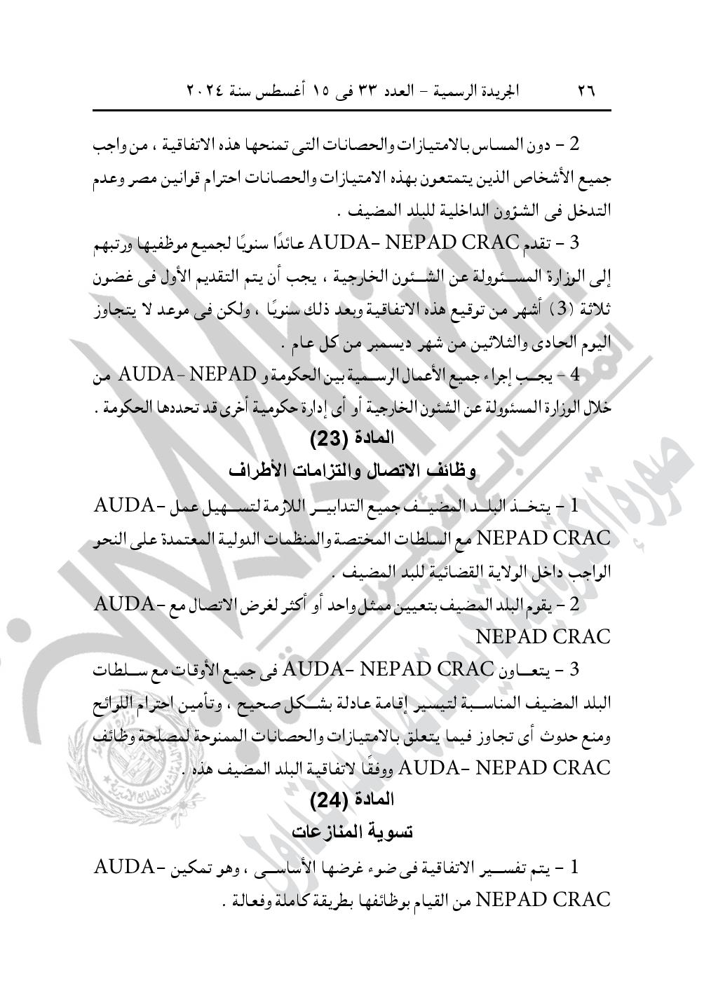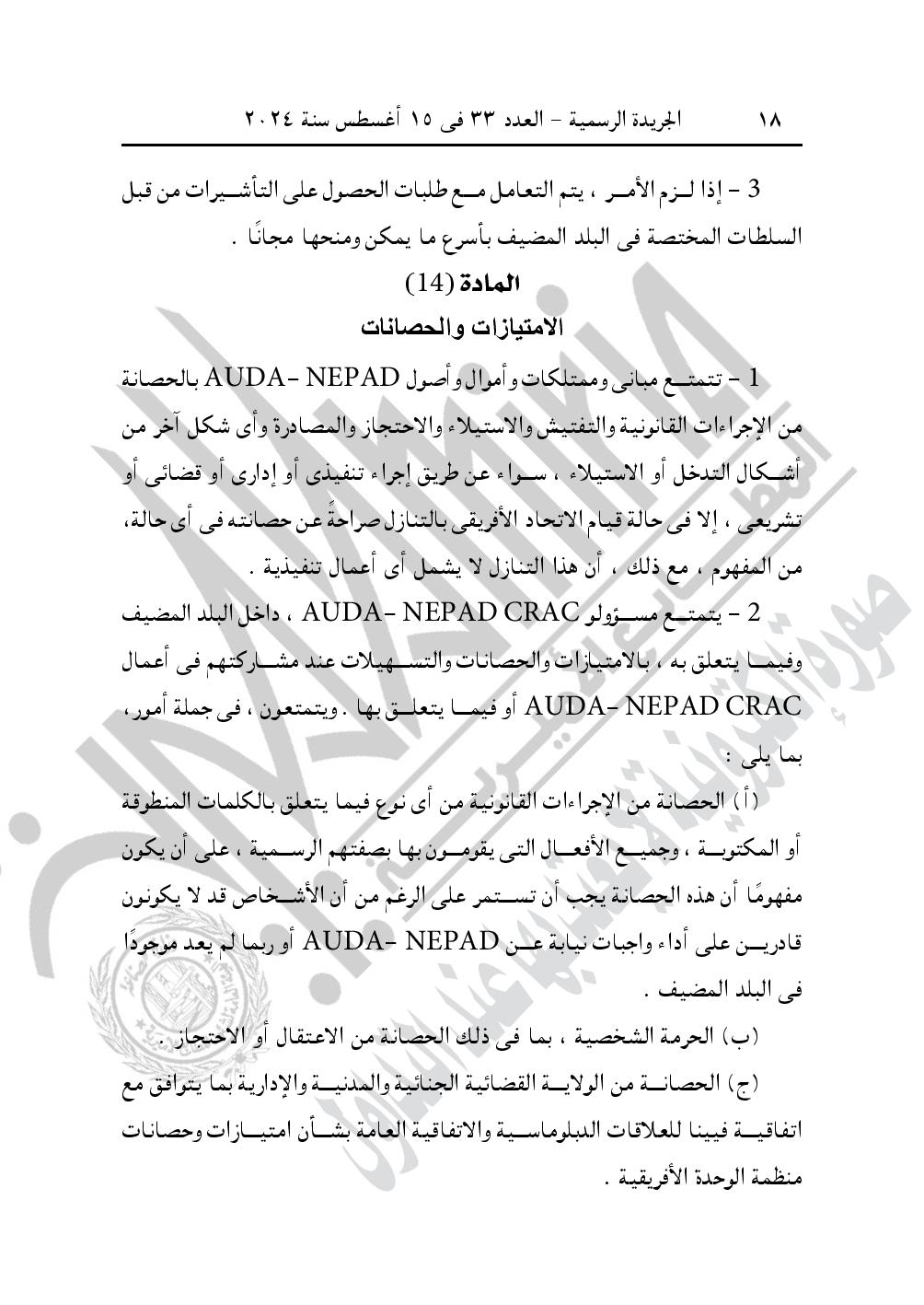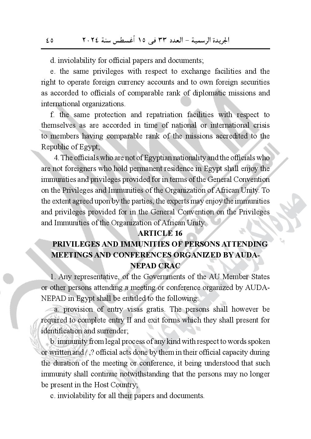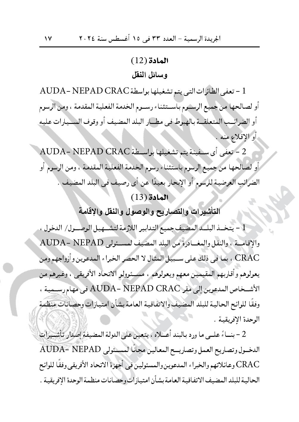 NEPAD CRCA) وعلاقتها مع البلد المضيف، في إقليم البلد المضيف.