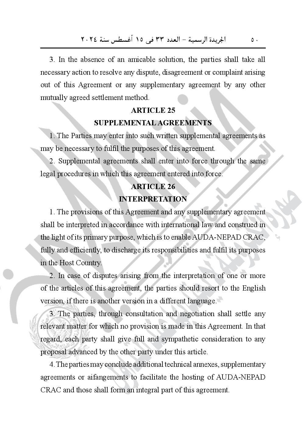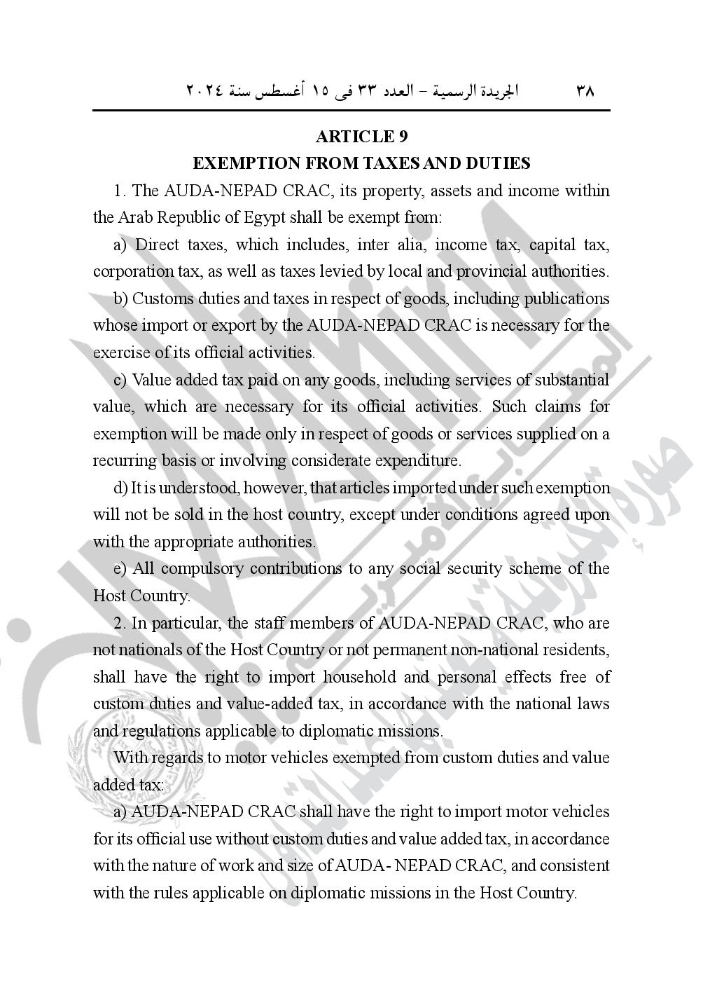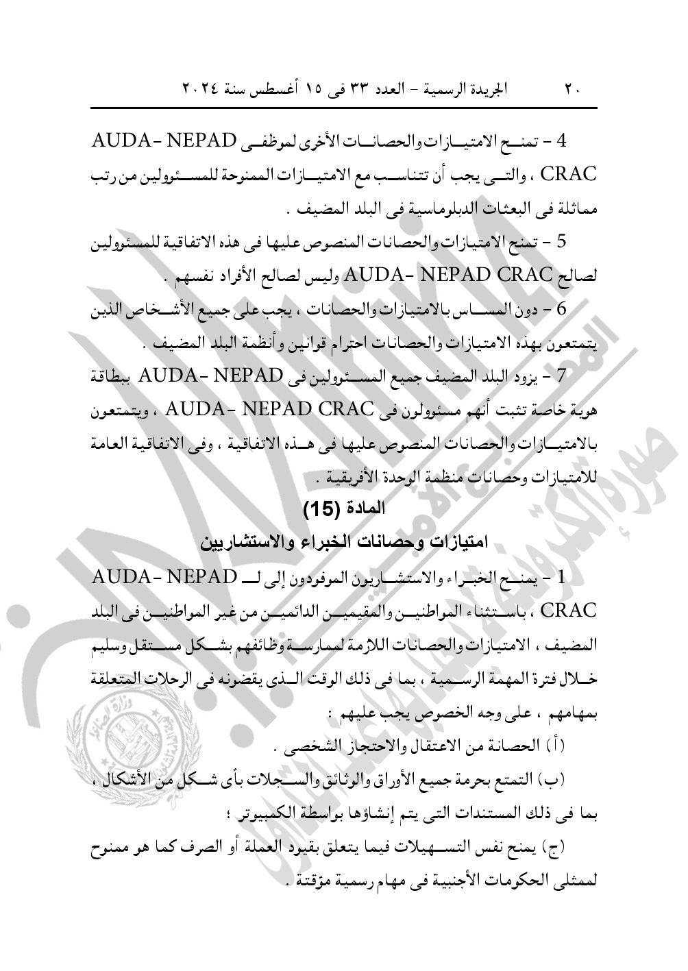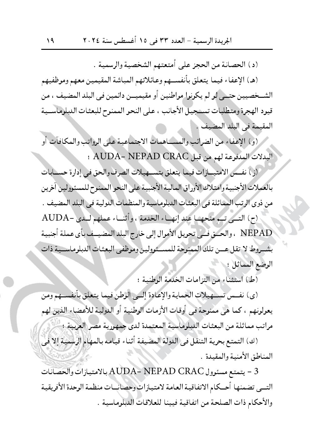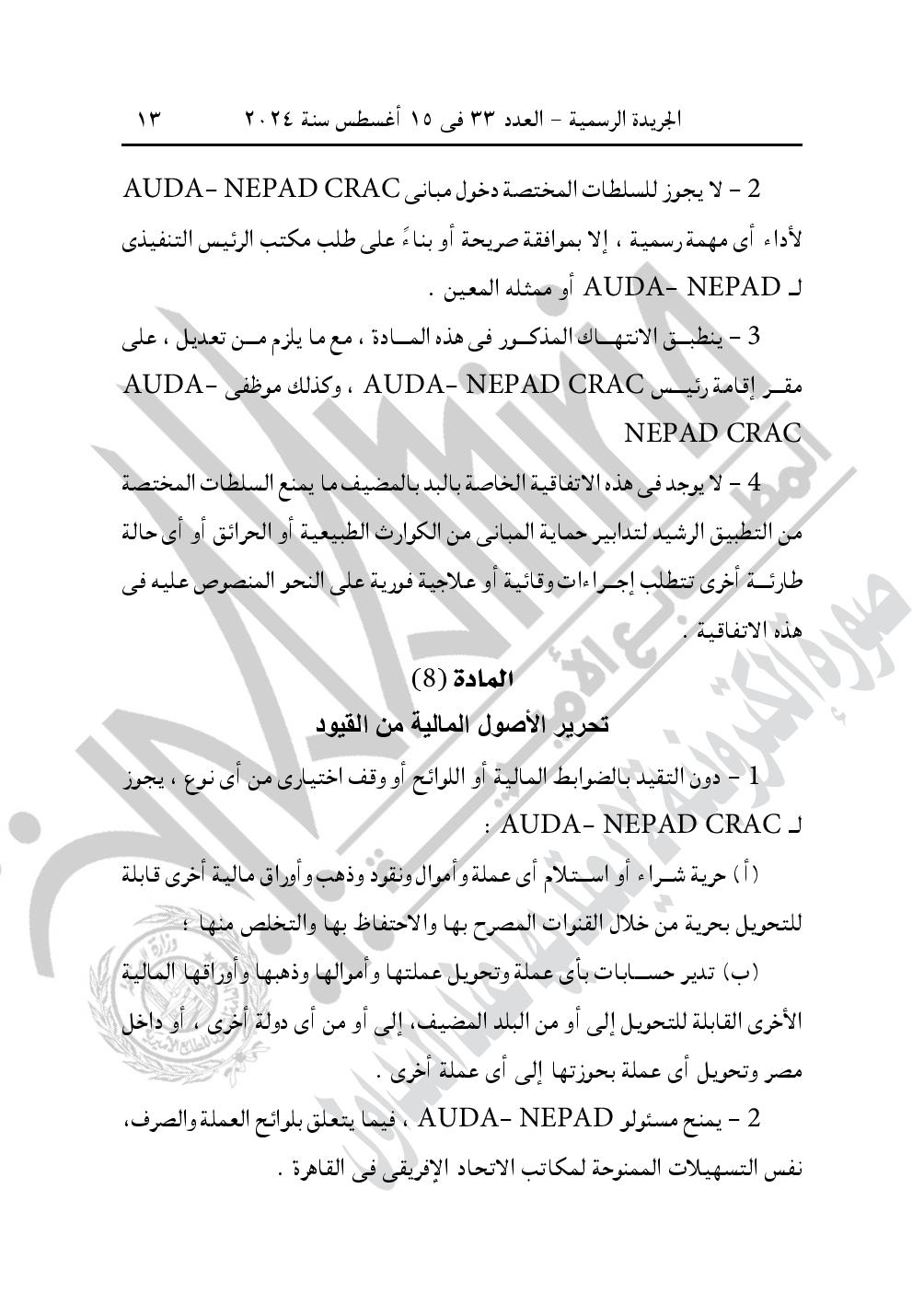 NEPAD CRCA) وعلاقتها مع البلد المضيف، في إقليم البلد المضيف.