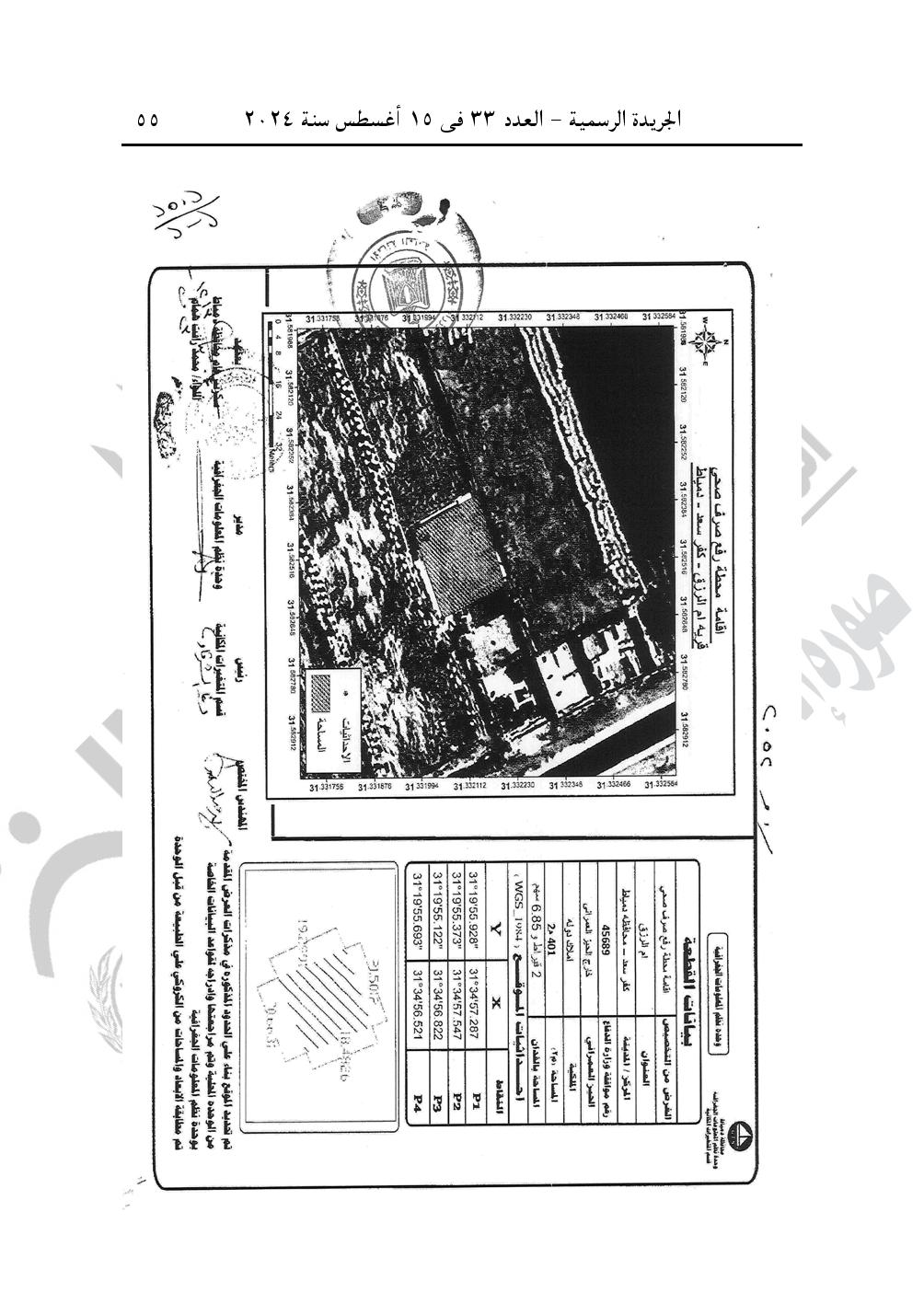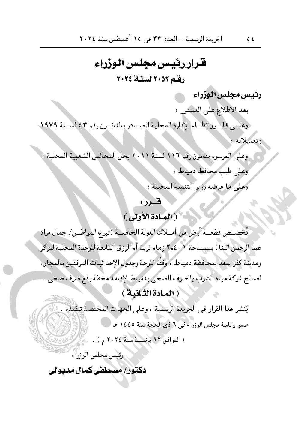-قـرار رئيـس مجلـس الـوزراء 2052 لسنة 2024، بتخصيص قطعة أرض من أملاك الدولة الخاصة، تبرع جمال مراد عبد الرحمن البنا، بمساحة 401م2 زمام قرية أم الرزق التابعة للوحدة المحلية لمركز ومدينة كفر سعد بمحافظة دمياط، بالمجان، لصالح شركة مياه الشرب والصرف الصحى بدمياط إلقامة محطة رفع صرف صحى.