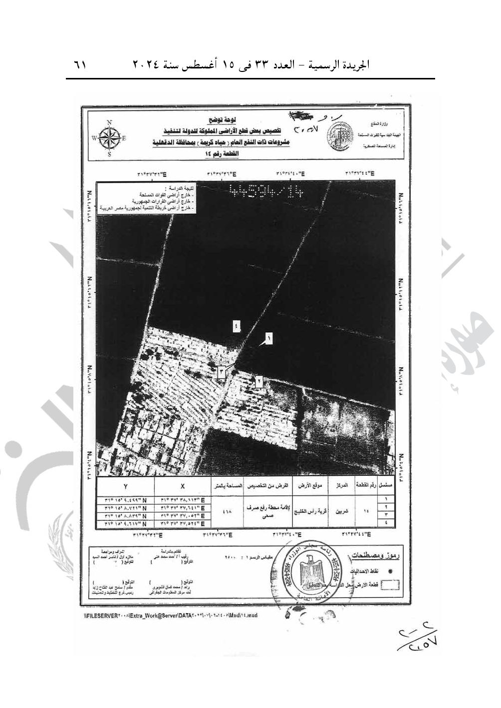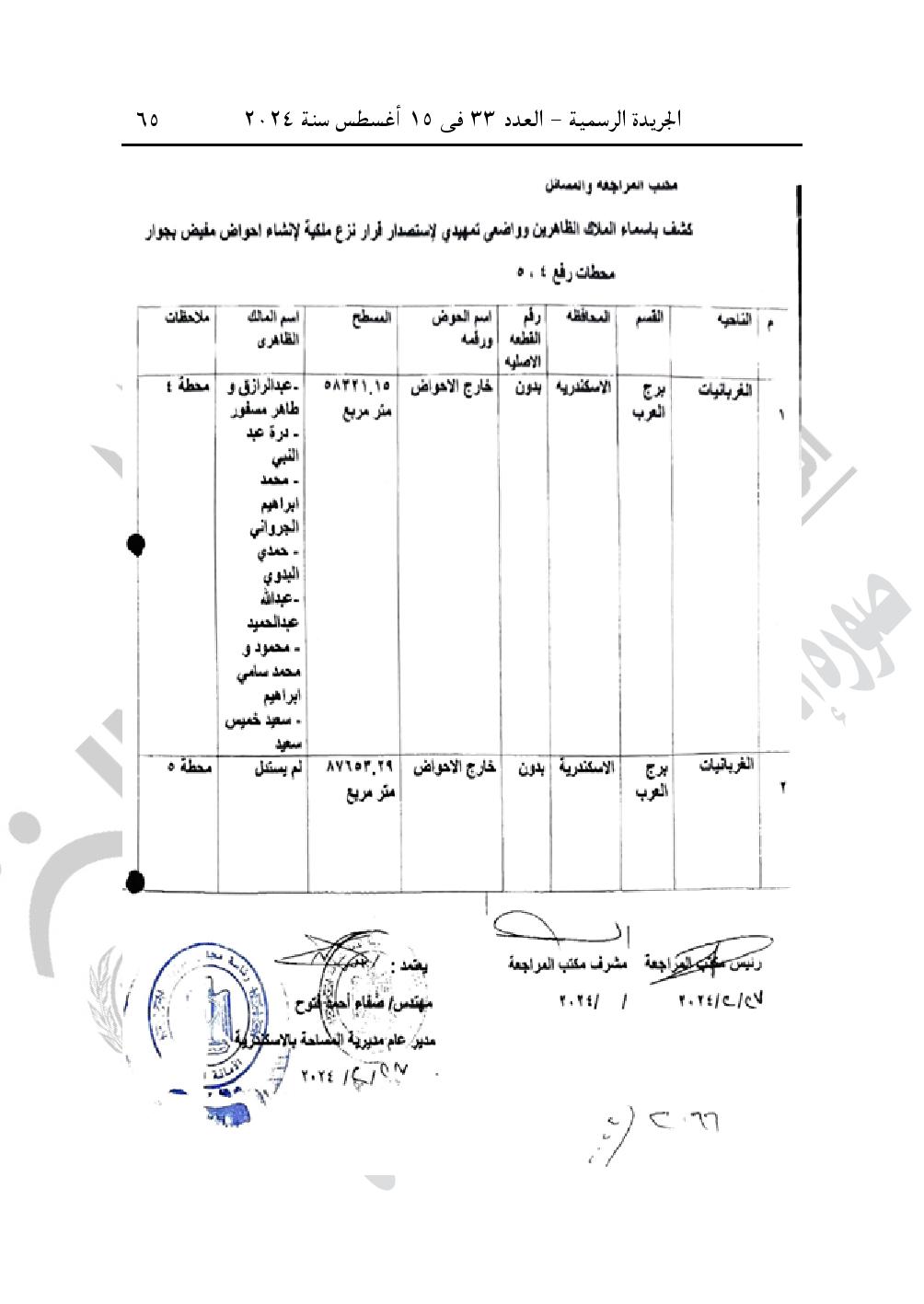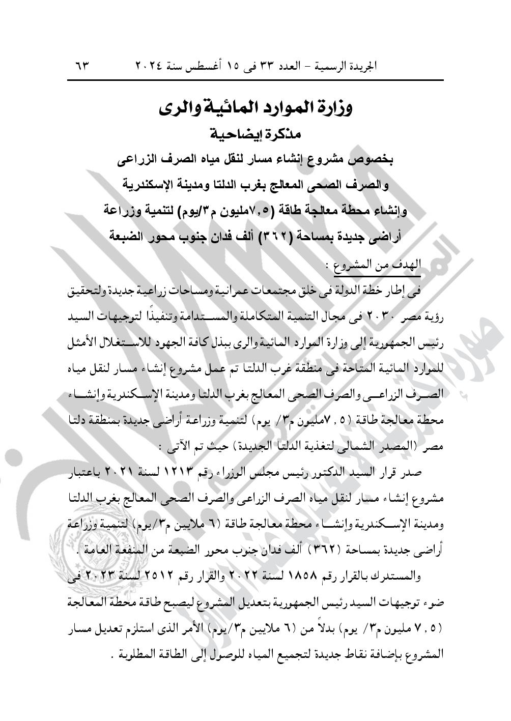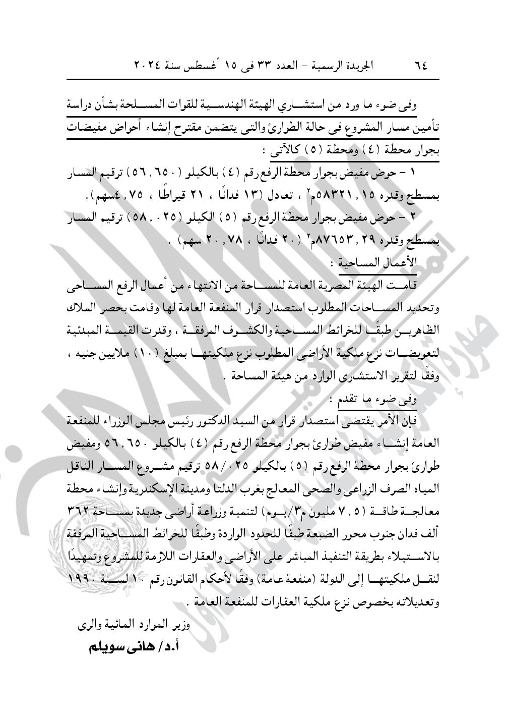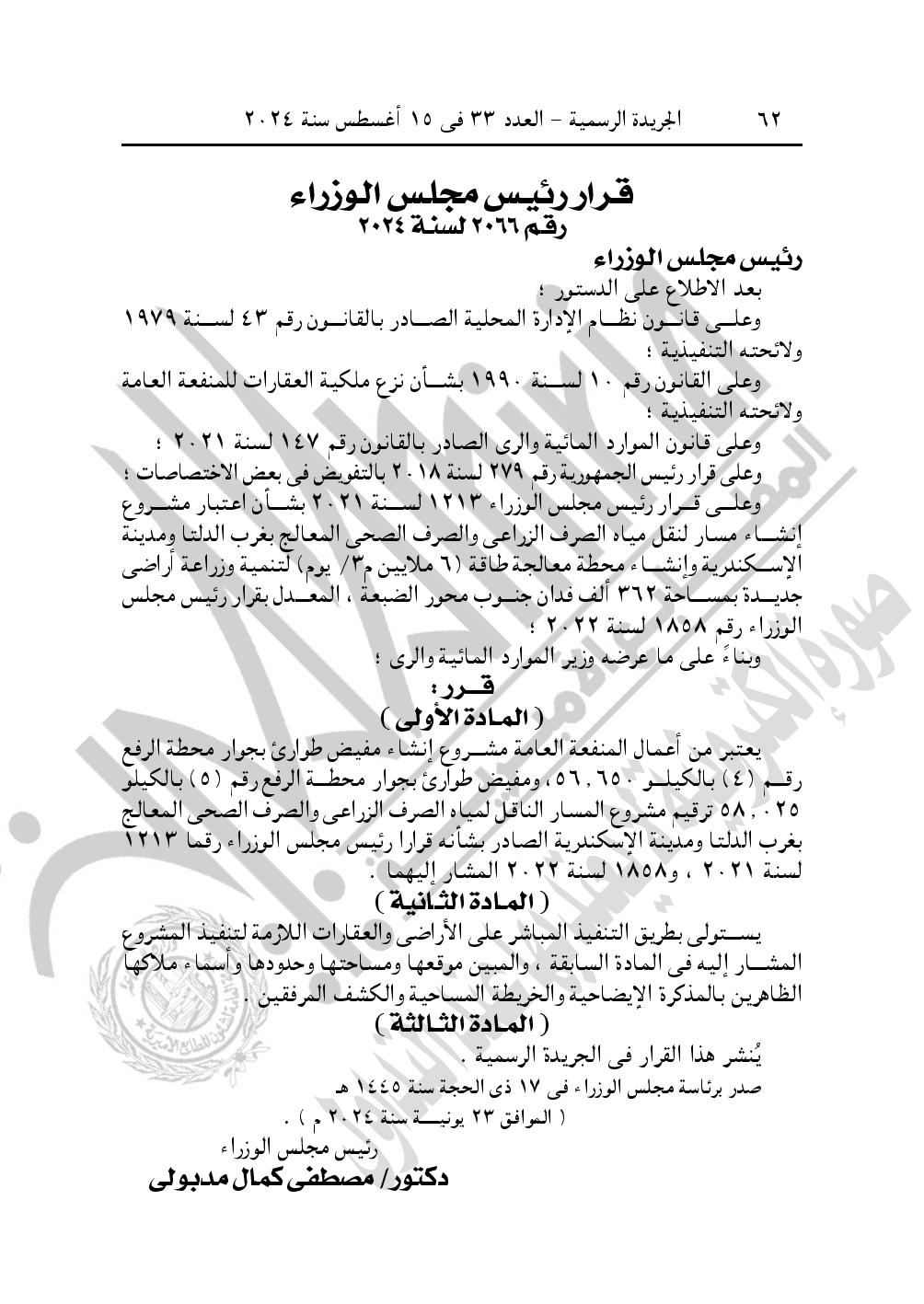 -و قـرار رئيـس مجلـس الـوزراء رقـم 2066 لسنـة 2024، باعتبار مشروع إنشاء مفيض طوارئ بجوار محطة الرفع رقم (4 ) بالكيلو 56٫650،ومفيض طوارئ بجوار محط ة الرفع رقم (5 ) بالكيلو 58٫025 ترقيم مشروع المسار الناقل لمياه الصرف الزراعى والصرف الصحى المعالج بغرب الدلتا ومدينة الإسكندرية، من أعمال المنفعة العامة.
