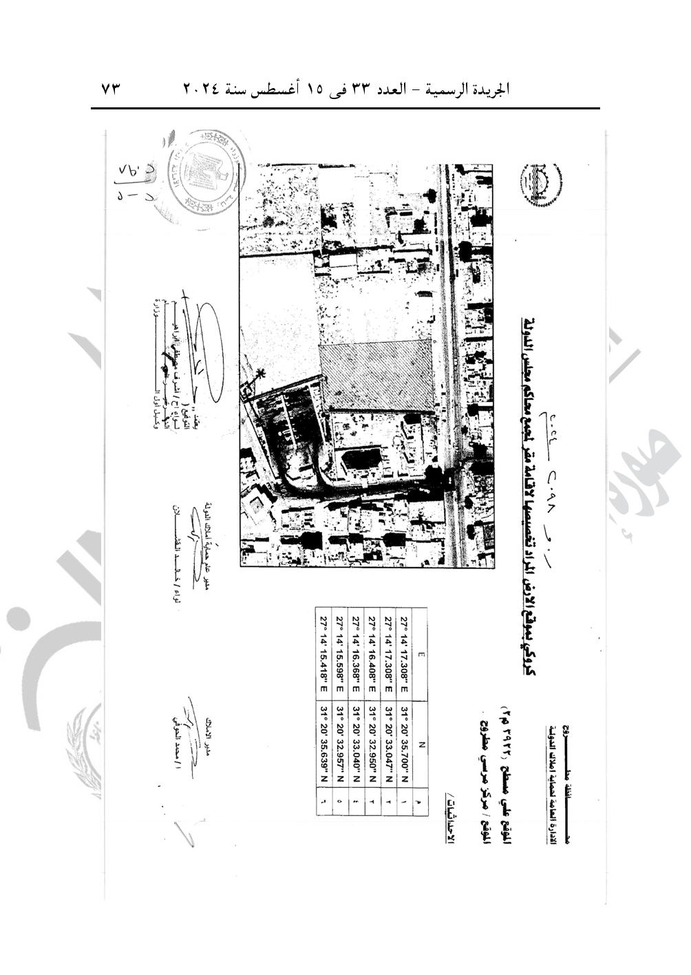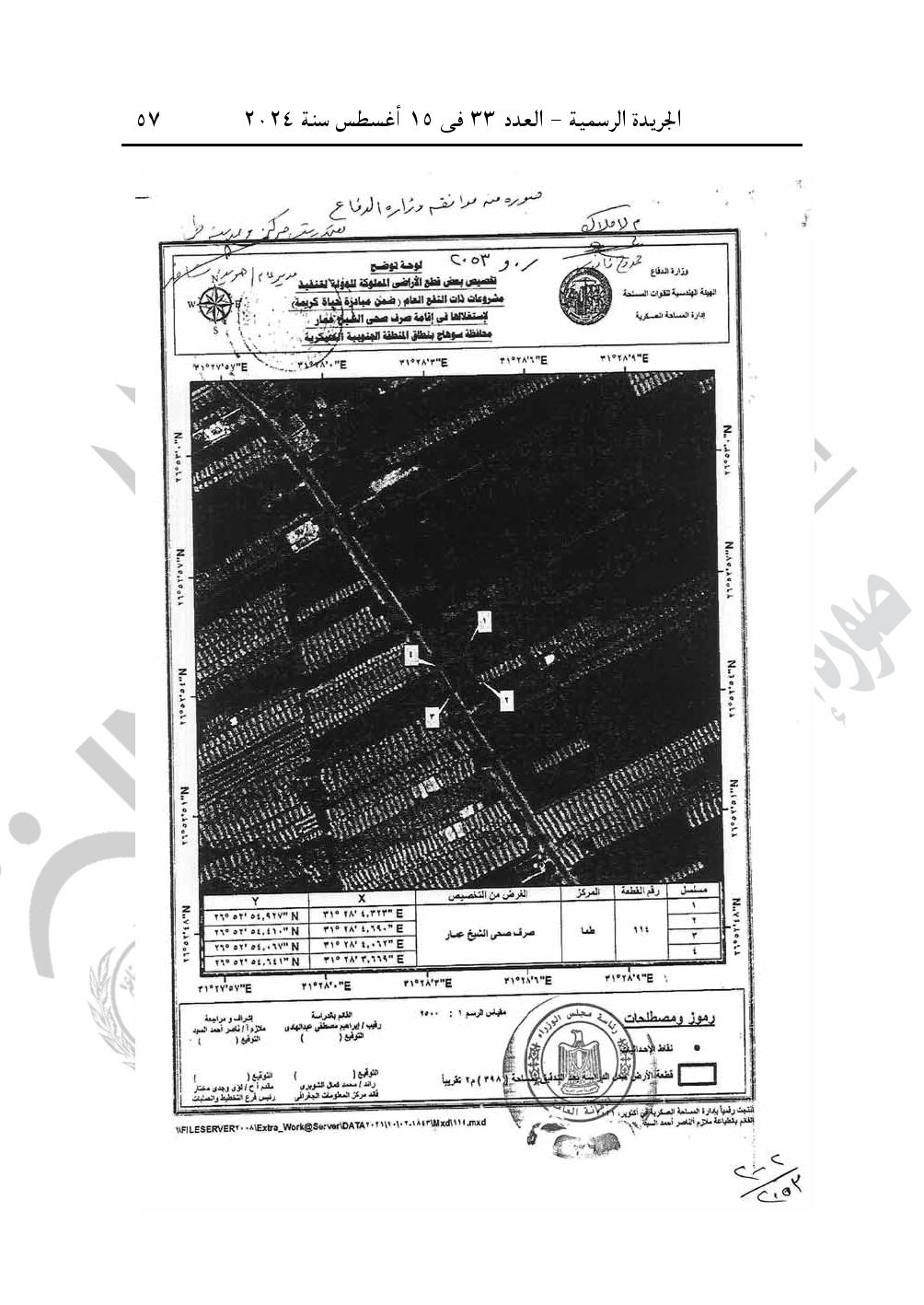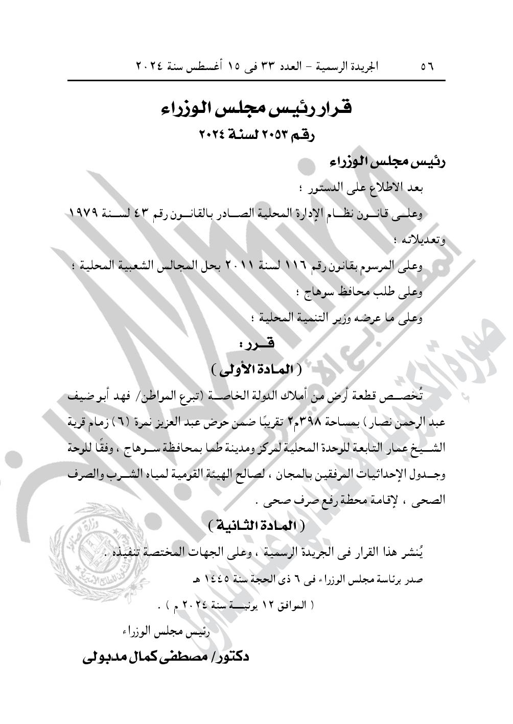 -وقرار رئيس مجلـس الـوزراء رقـم 2053 لسنة 2024، بتحصيص قطعة أرض من أملاك الدولة الخاصة، تبرع المواطن فهد أبو ضيف، ضمن حوض عبد العزيز نمرة (6) زمام قرية عبد الرحمن نصار، بمساحة 398م2 تقريبًا، بزمام الشيخ عمار التابعة للوحدة المحلية لمركز ومدينة طما بمحافظة سوهاج، بالمجان، لصالح الهيئة القومية لمياه الشرب والصرف الصحى، لإقامة محطة رفع صرف صحى.