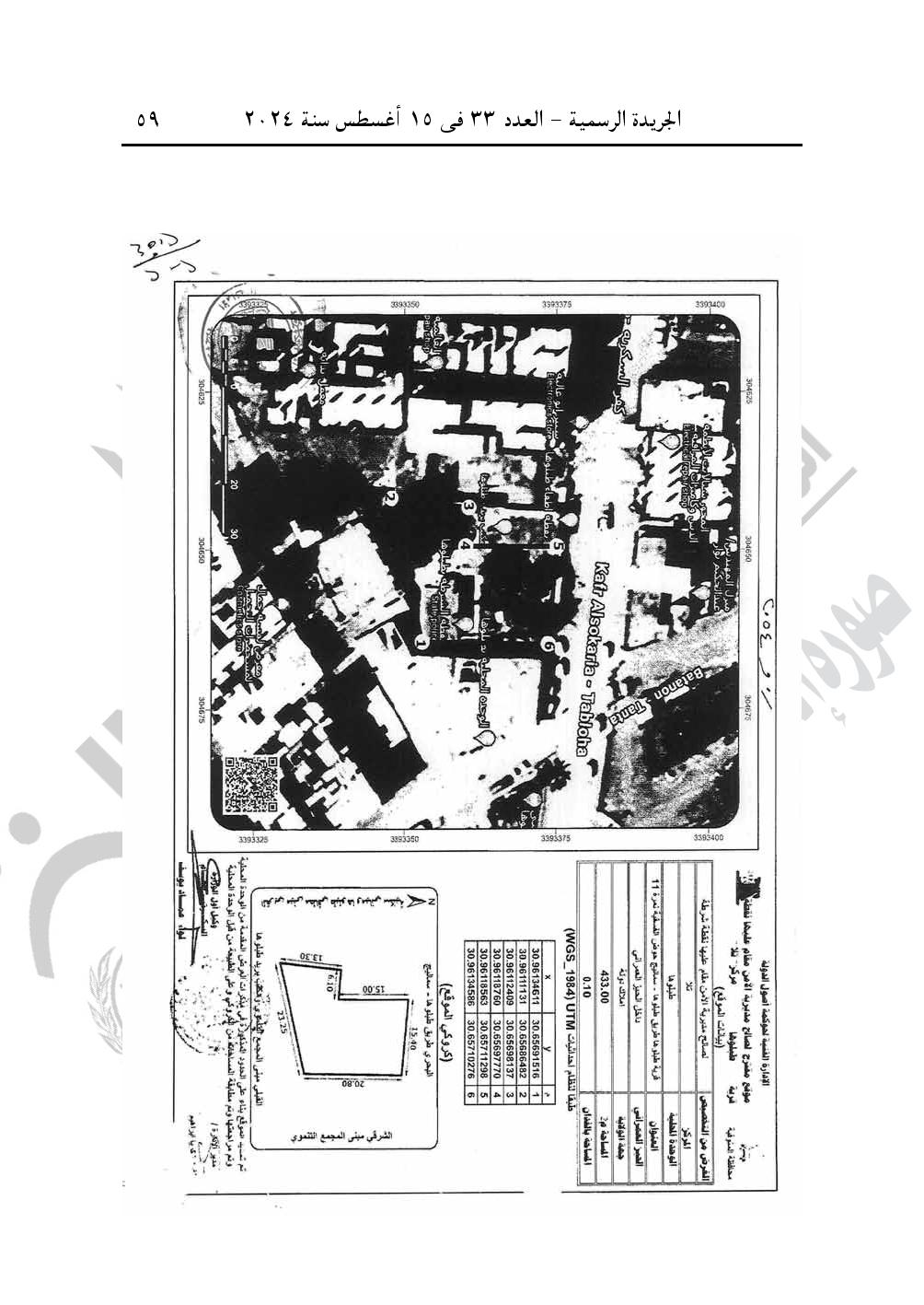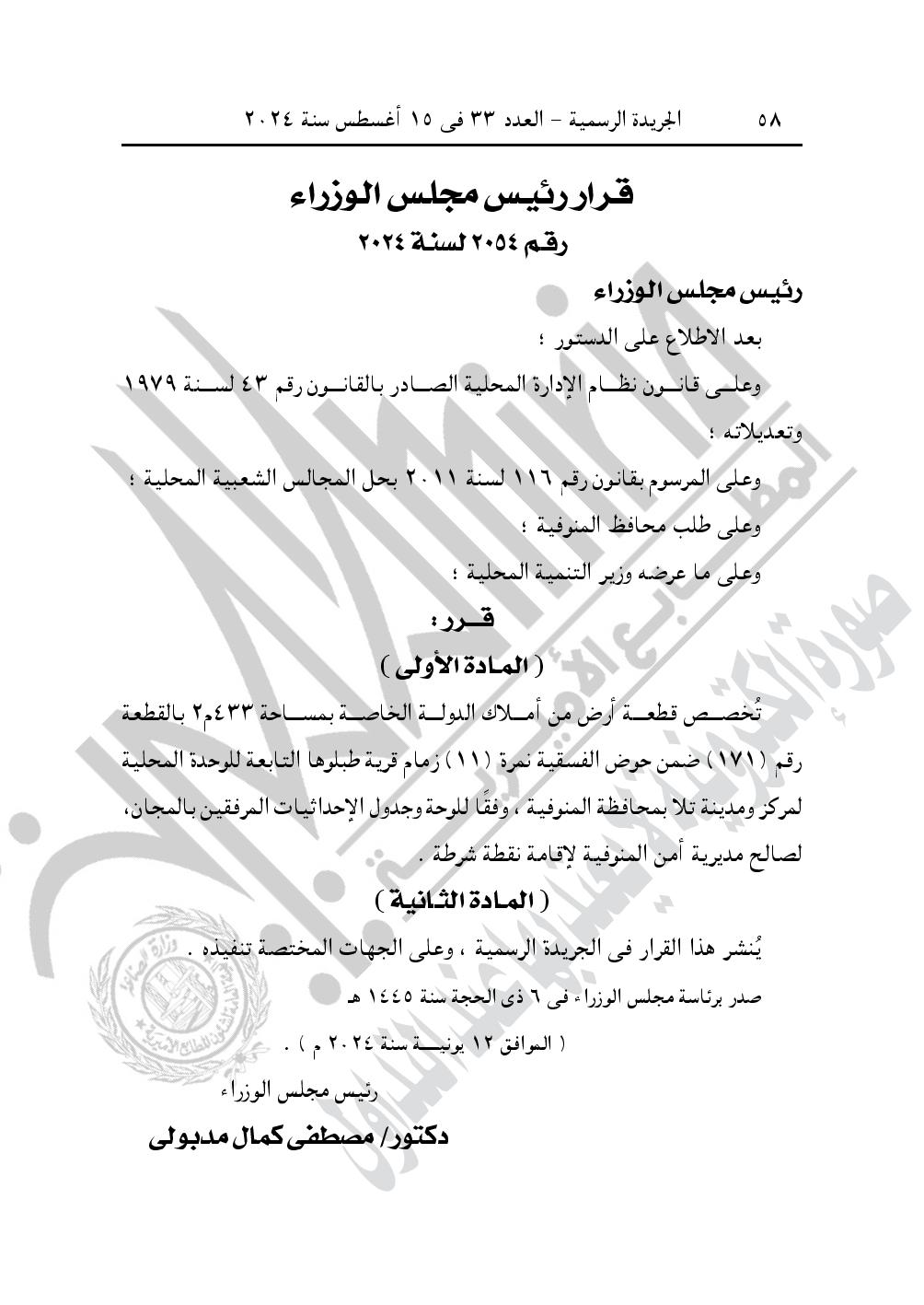-و قرار رئيس الوزراء رقـم 2054 لسنـة 2024، بتخصيص قطعة أرض من أملاك الدولة الخاصة بمساحة 433م2، بالقطعة رقم (171) ضمن حوض الفسقية نمرة (11) زمام قرية طبلوها التابعة للوحدة المحلية لمركز ومدينة تلا بمحافظة المنوفية، بالمجان، لصالح مديرية أمن المنوفية لإقامة نقطة شرطة.