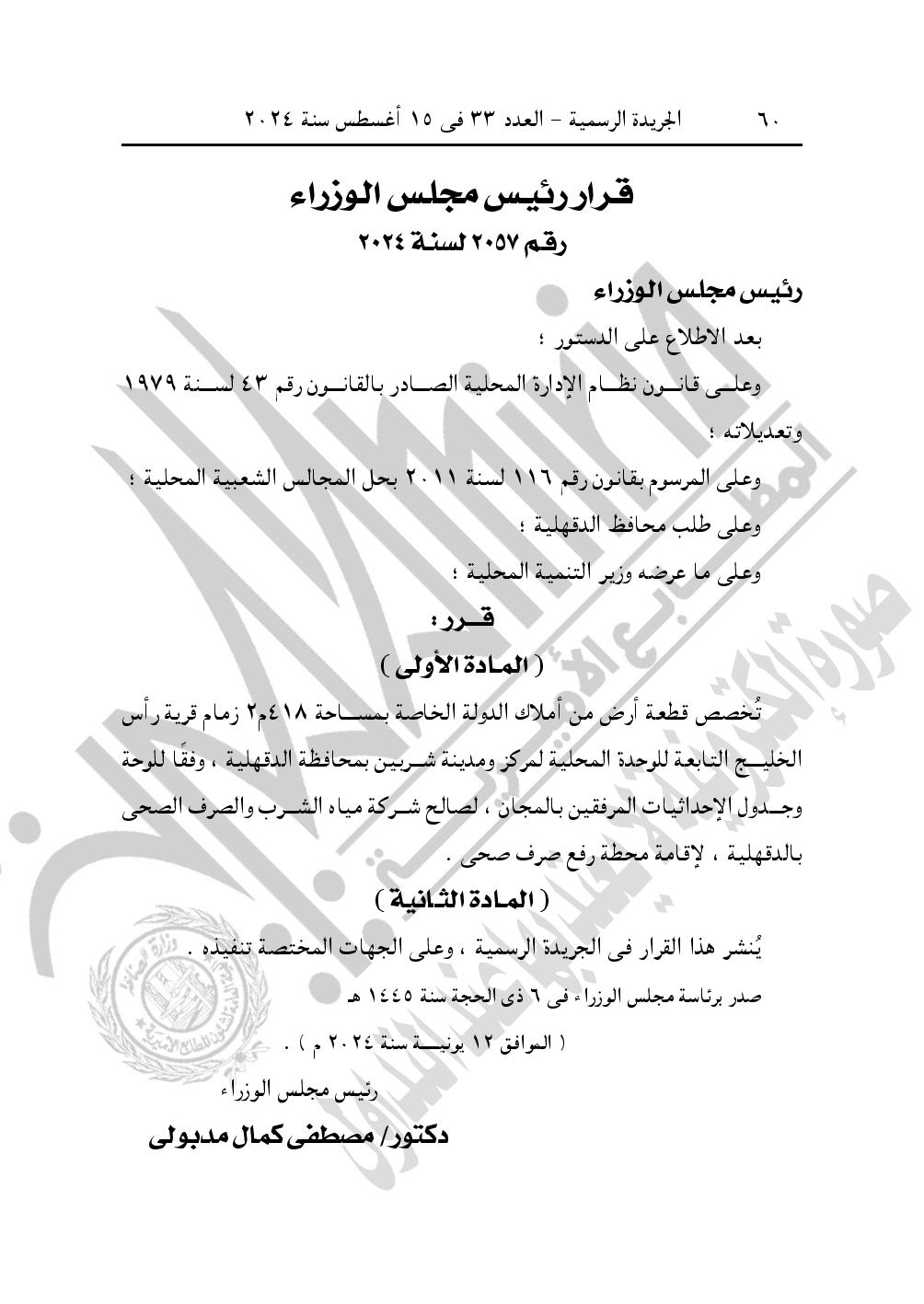 -وقرار رئيـس مجلـس الـوزراء رقـم 2057 لسنة 2024، بتخصيص قطعة أرض من أمالك الدولة الخاصة بمساحة 418م2 زمام قرية رأس الخليج التابعة للوحدة المحلية لمركز ومدينة شربين بمحافظة الدقهلية، بالمجان، لصالح شركة مياه الشرب والصرف الصحى بالدقهلية، لإقامة محطة رفع صرف صحى.