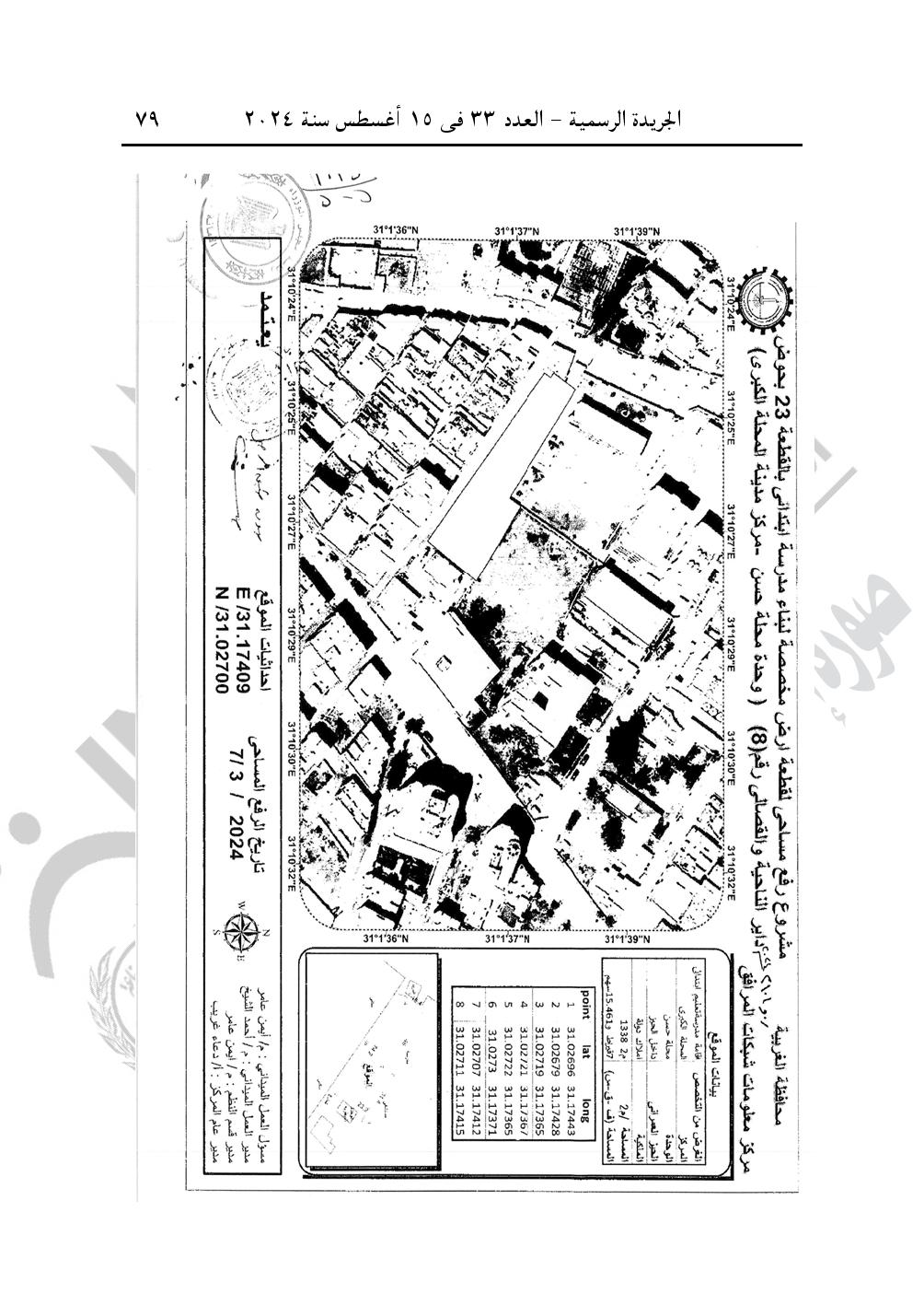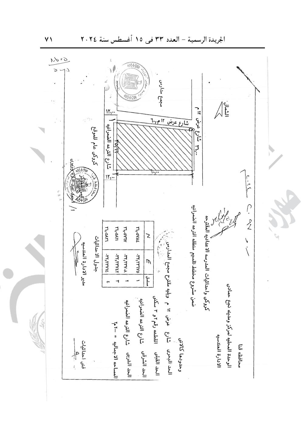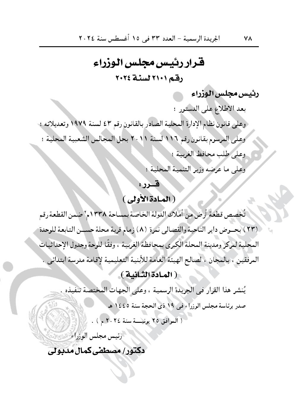 -وقرار رئيس مجلس الوزراء رقـم 2101 لسنـة 2024، بتخصيص قطعة أرض من أملاك الدولة الخاصة بمساحة 1338م، ضمن القطعة (23) بحوض داير الناحية والقصالى نمرة (8) زمام قرية محلة حسن التابعة للوحدة المحلية لمركز ومدينة المحلة الكبرى بمحافظة الغربية، بالمجان، لصالح الهيئة العامة للأبنية التعليمية لإقامة مدرسة ابتدائى.