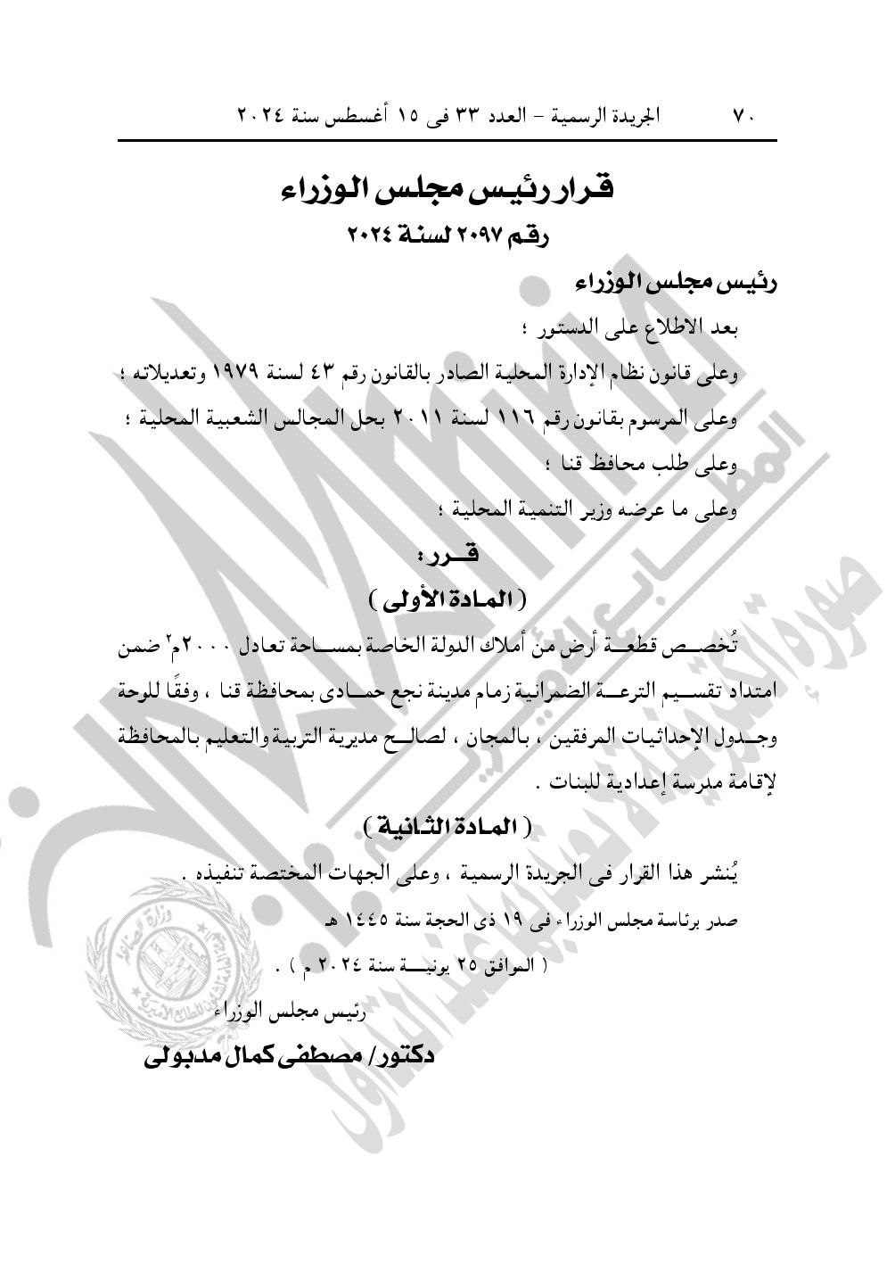 -وقرار قـرار رئيـس مجلـس الـوزراء رقـم 2097 لسنـة 2024، بتخصيص قطعة أرض من أملاك الدولة الخاصة بمساحة تعادل 2000م، امتداد تقسيم الترعة الضمرانية، زمام مدينة نجع حمادى بمحافظة قنا، بالمجان، لصالح مديرية التربية والتعليم بالمحافظة، لإقامة مدرسة إعدادية للبنات.