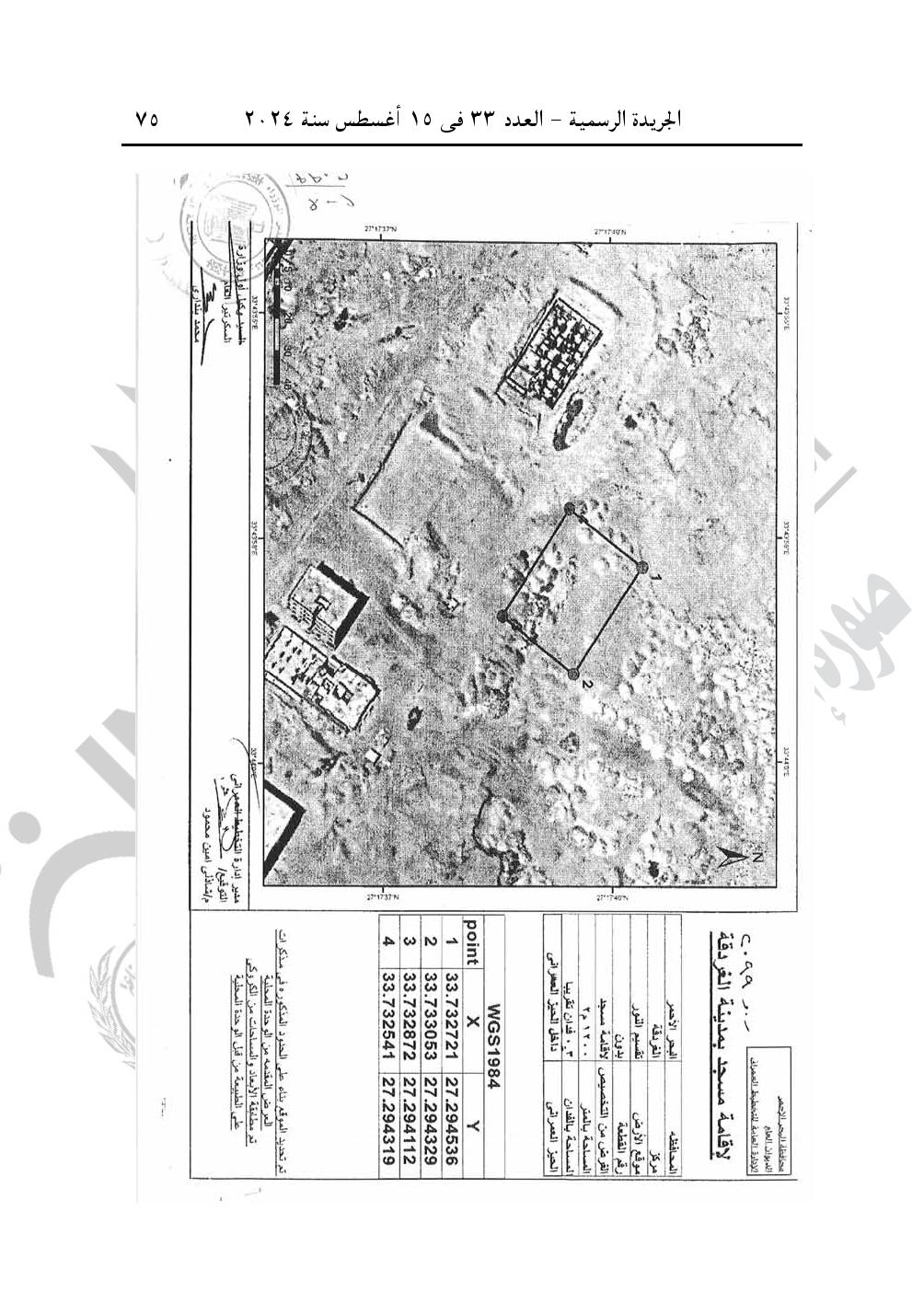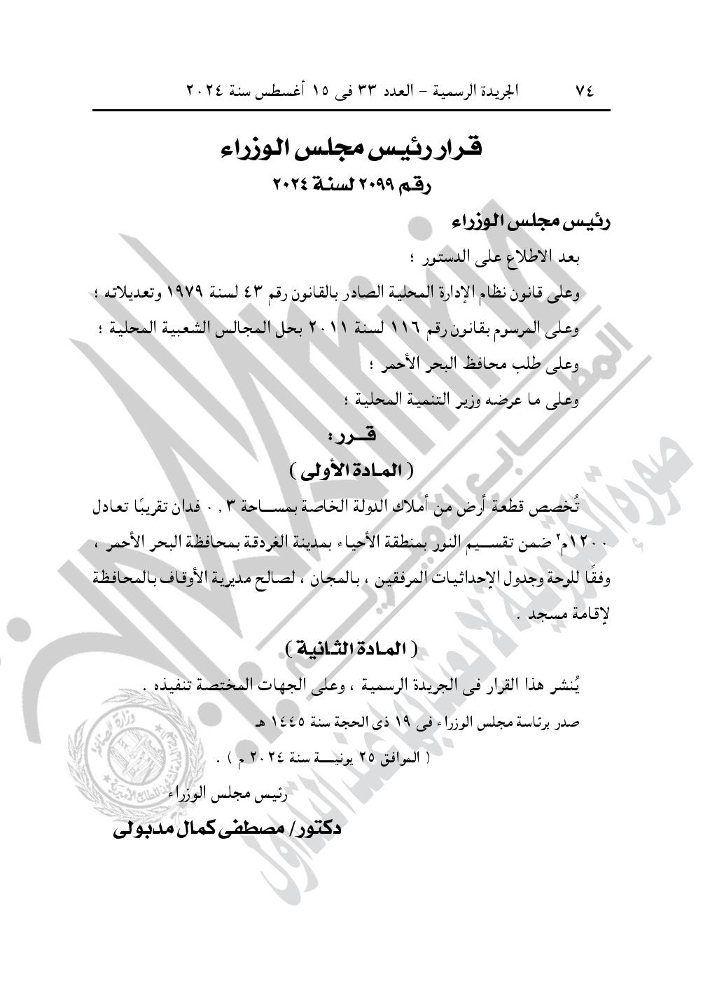 -وقرار رئيـس مجلـس الـوزراء رقـم 2099 لسنـة 2024، قطعة أرض من أمالك الدولة الخاصة بمس احة 0٫3 فدان تقريبًا ضمن تقسيم النور بمنطقة الأحياء بمدينة الغردقة بمحافظة البحر الأحمر، تعادل 1200م، بالمجان، لصالح مديرية األوقاف بالمحافظة لإقامة مسجد.
