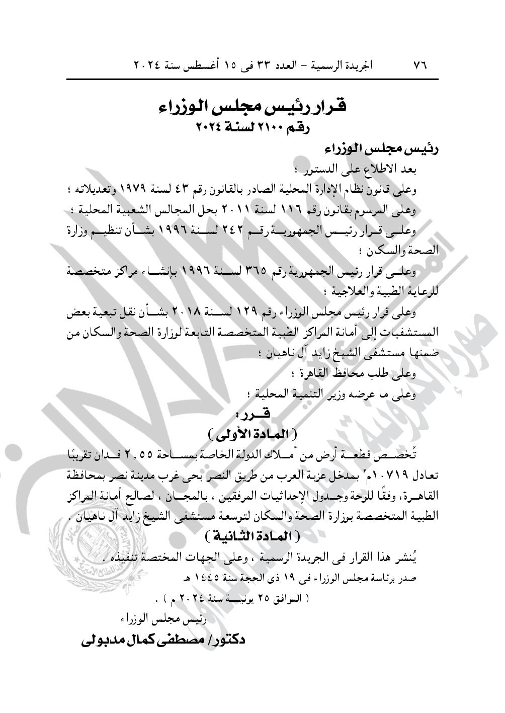 -وقرار رئيـس مجلـس الـوزراء رقـم 2100 لسنـة 2024، بتخصيص قطعة أرض من أملاك الدولة الخاصة بمساحة 2٫55 فدان تقريبًا، بمدخل عزبة العرب من طريق النصر بحى غرب مدينة نصر بمحافظة القاهرة، بالمجان، لصالح أمانة المراكز الطبية المتخصصة بوزارة الصحة والسكان لتوسعة مستشفى الشيخ زايد آل ناهيان.