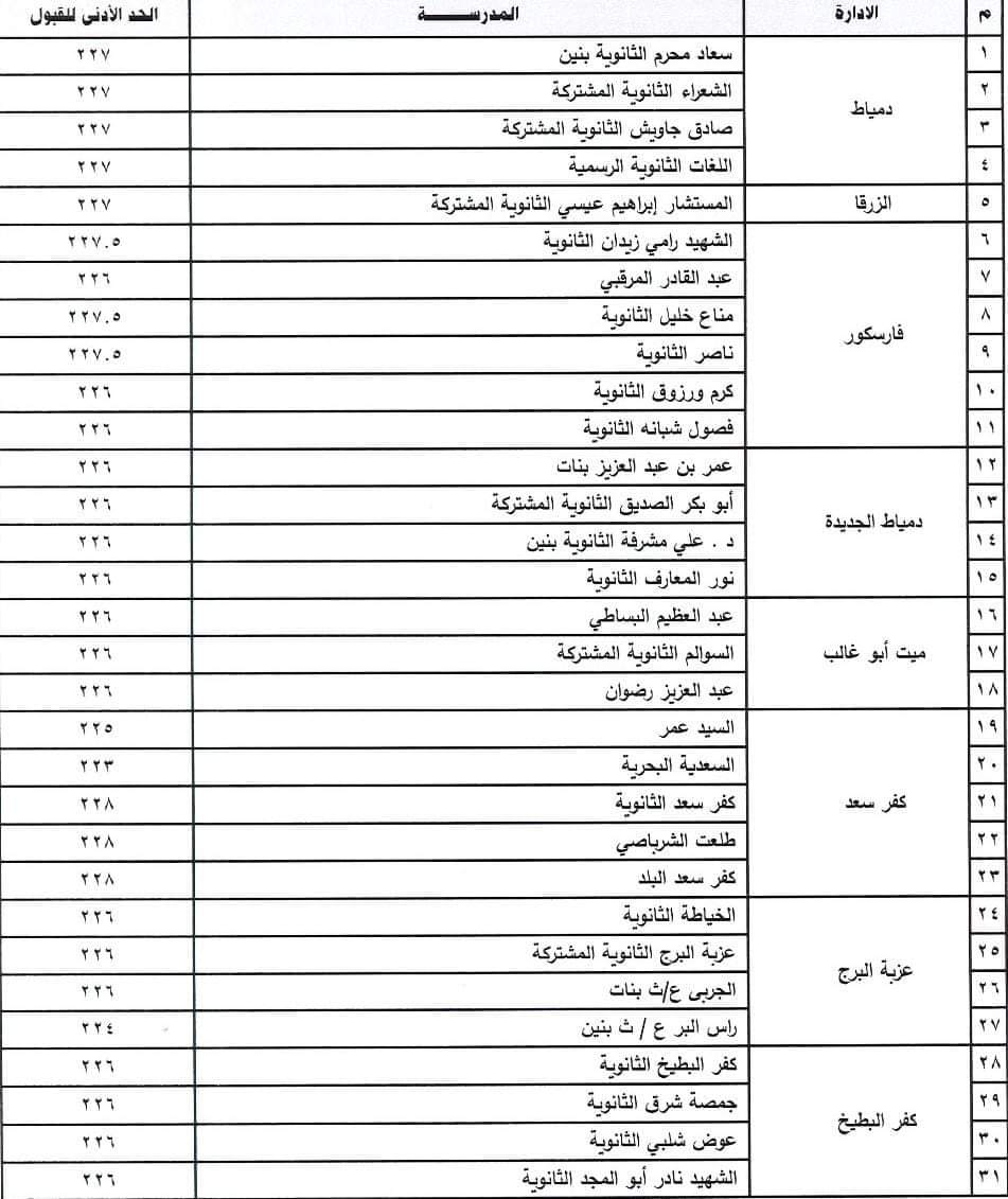 كما تم النزول بالحد الأدنى للقبول بمدارس عمر بن عبد العزيز بنات وأبو بكر الصديق الثانوية المشتركة والدكتور على مشرفة الثانوية بنين ونور المعارف الثانوية بإدارة دمياط الجديدة التعليمية إلى مجموع ٢٢٦ درجة، وبإدارة ميت أبو غالب تم النزول بالحد الأدنى للقبول بمدارس عبد العظيم البساطى والسوالم الثانوية المشتركة وعبد العزيز رضوان إلى مجموع ٢٢٦ درجة.