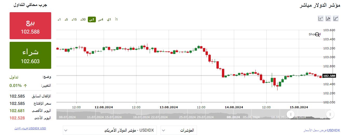 مؤشر الدولار، هبط مؤشر العملة الخضراء خلال حركة التداولات العالمية ليلامس مستوى 102.58 نقطة اليوم الخميس 15 أغسطس 2024 بحركات البيع والشراء.