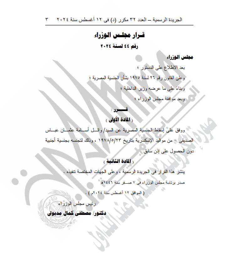 نشرت الجريدة الرسمية في عددها رقم 32 مكرر (د)، الصادر في 12 أغسطس لسنة 2024، قرار مجلس الوزراء رقم 44 لسنة 2024، بشأن إسقاط الجنسية المصرية عن المخرج وائل أسامة عثمان عباس الصديقي.