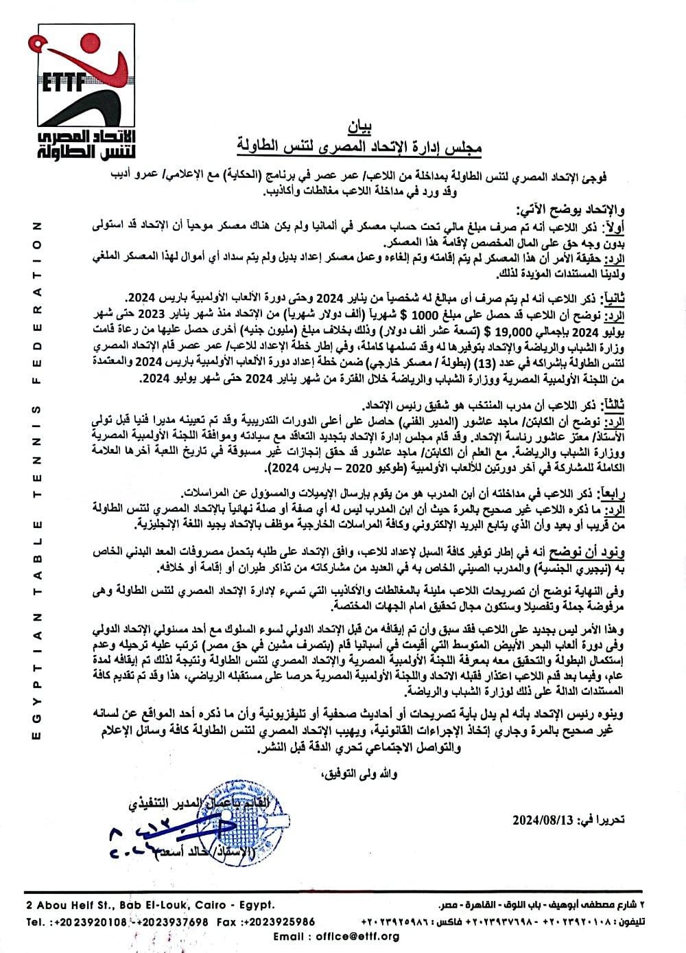 وجاء رد اتحاد تنس الطاولة على عمر عصر لاعب المنتخب، من خلال شرح تفاصيل إعداد اللاعبين وأيضا أوجه الصرف، وجاء الرد كالتالي: