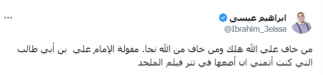 وقال إبراهيم عيسى في تعليقه على أزمة فيلم الملحد "من خاف علي الله هلك، ومن خاف من الله نجا. مقولة الإمام علي بن أبي طالب التي كنت أتمني ان أضعها في تتر فيلم الملحد"