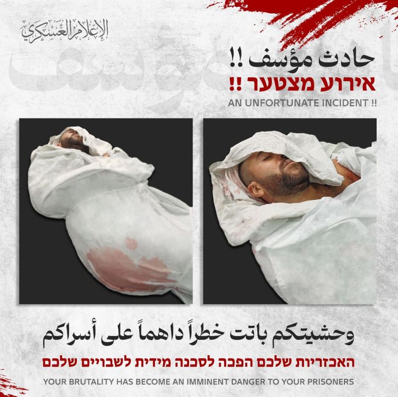 نشرت كتائب القسام الجناح العسكري لحركة حماس، صورة للأسير الإسرائيلي الذي قتل على يد حارسه، مع عبارة "وحشيتكم باتت خطرا داهما على أسراكم".