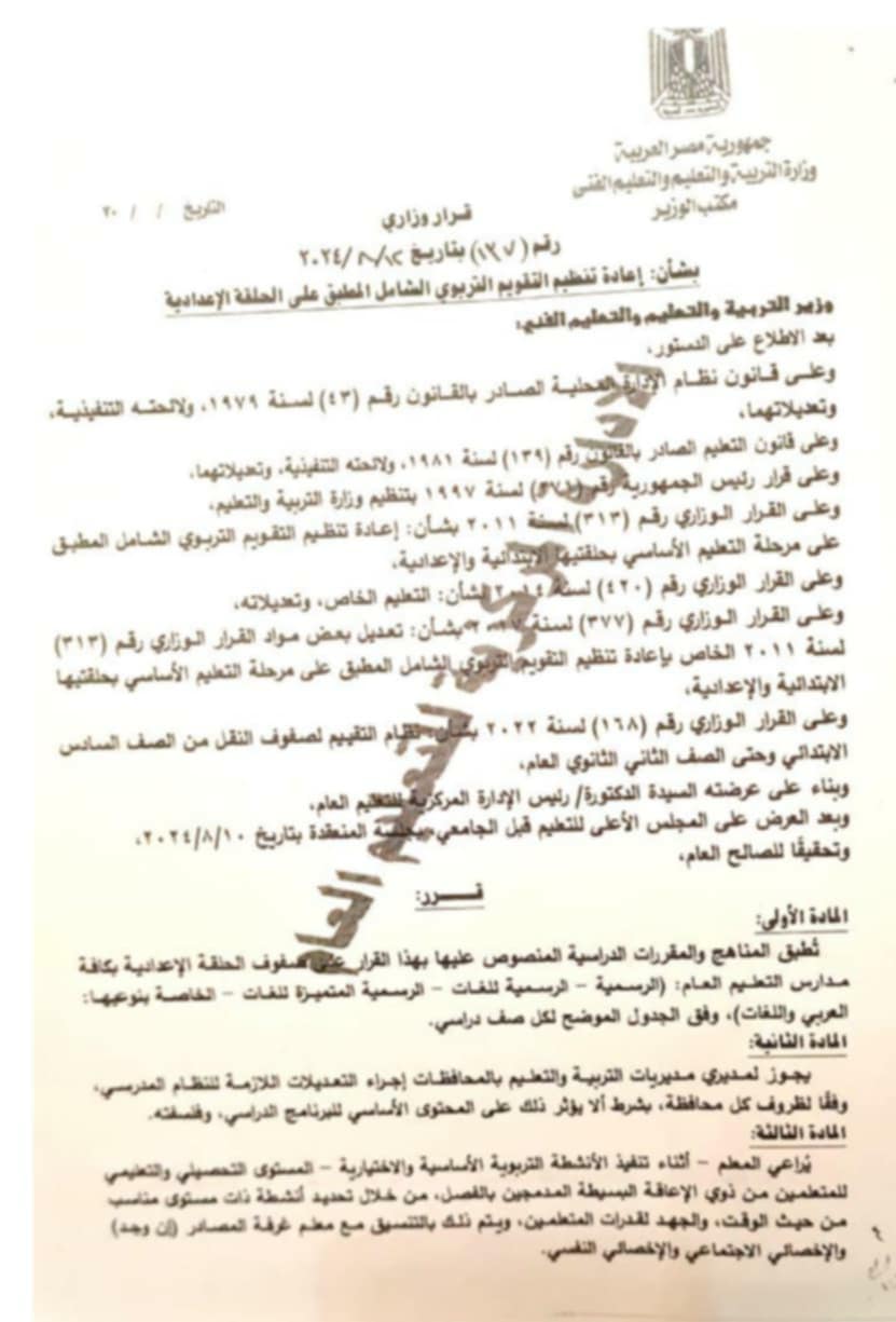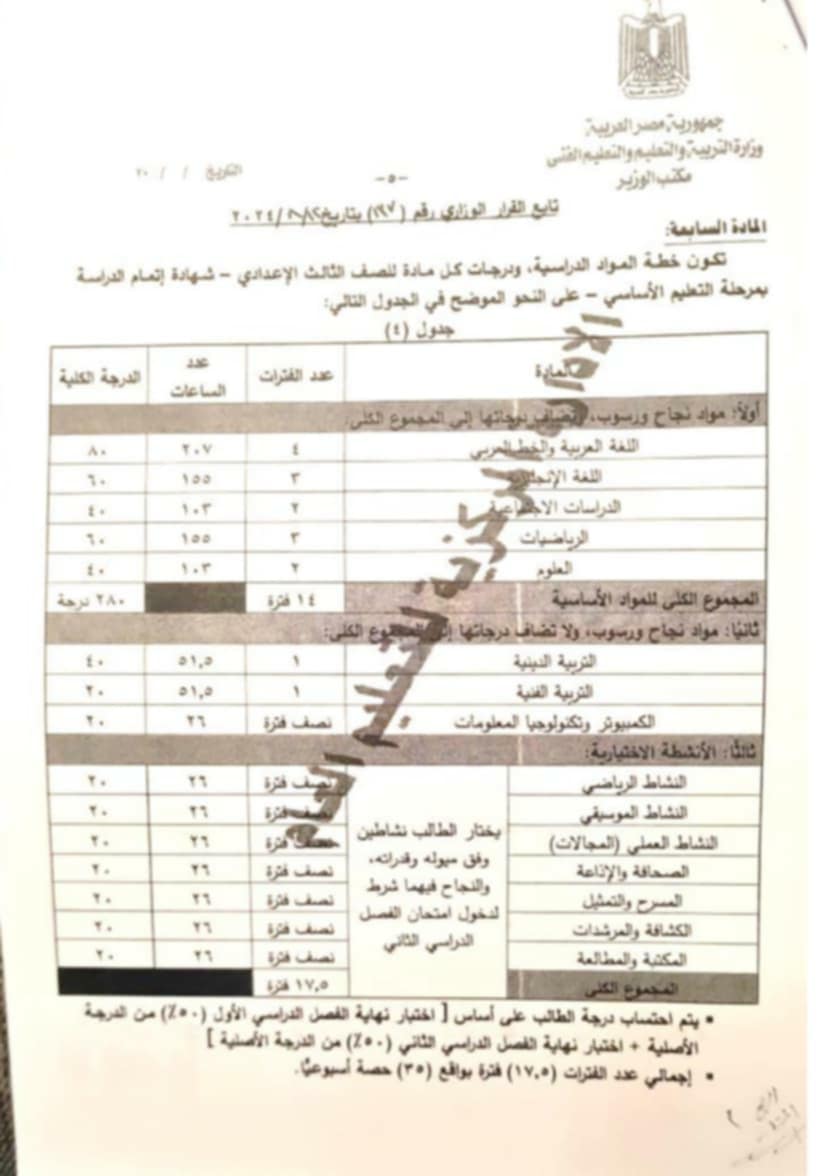كشفت وزارة التربية والتعليم والتعليم الفني عن المواد الأساسية المقررة على الصف الثالث الإعدادي، وذلك وفقا لقرار إعادة تنظيم التقويم التربوي الشامل المطبق على الحلقة الإعدادية بالصفوف، وهي كالتالي:
