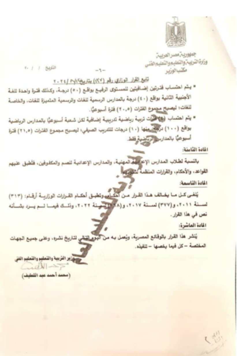 يتم احتساب فترتين إضافيتين للمستوى الرفيع بواقع 50 درجة وكذلك فترة واحدة للغة الأجنبية الثانية بواقع 40 درجة بالمدارس الرسمية للغات والرسمية المتميزة للغات والخاصة للغات ليصبح مجموع الفترات 20.5 فترة أسبوعيا ويتم احتساب 4 فترات تربية رياضية تدريبية إضافية لكل شعبة أسبوعيا بالمدارس الرياضية بواقع 100 درجة منها 10 درجات للتدريب الصيفي ليصبح مجموع الفترات 21.5 فترة أسبوعيا بالمدارس الرياضية فقط.