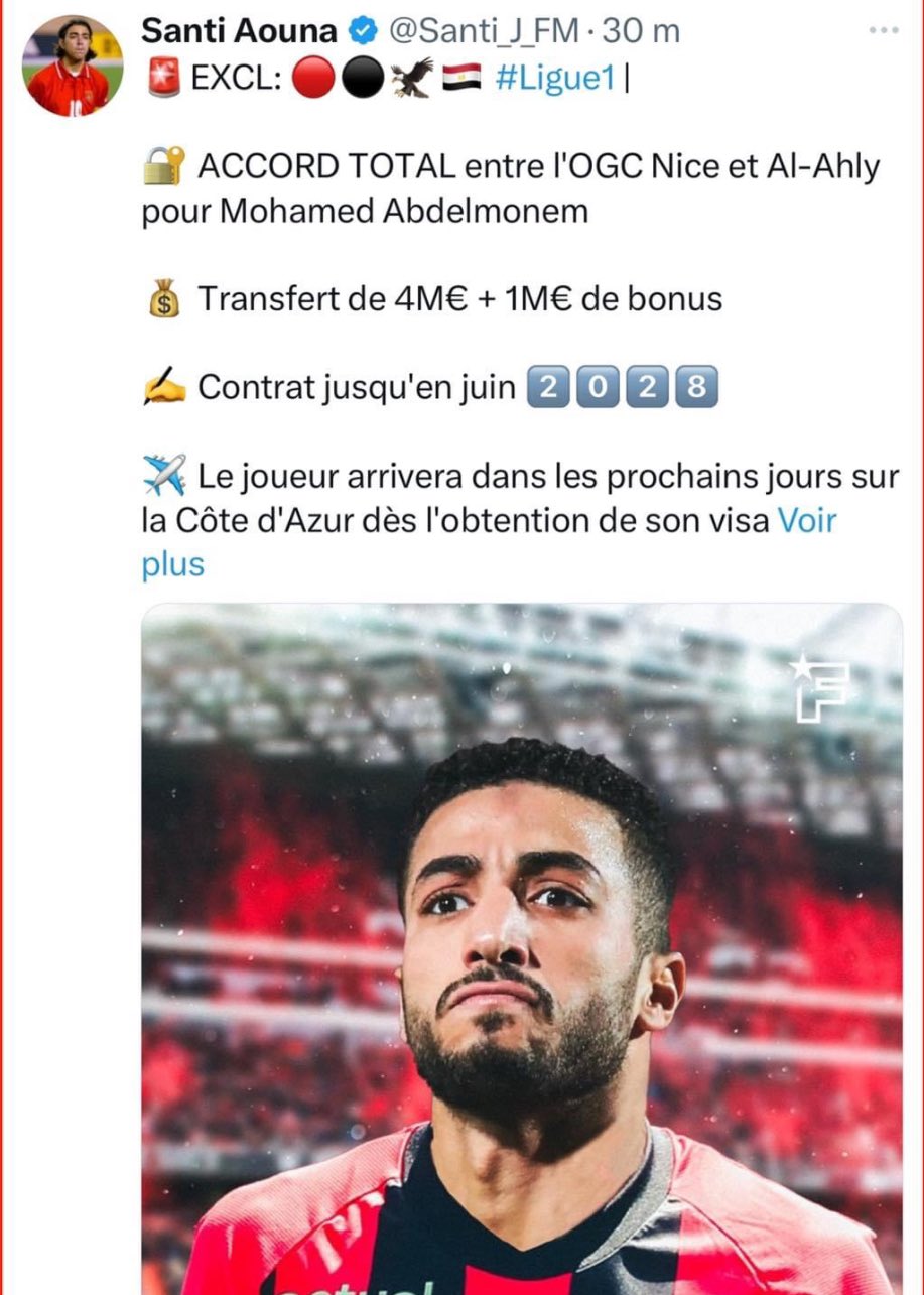 فيما كشف الصحفي سانتي أونا المتخصص في سوق الانتقالات، أنه تم الاتفاق بين النادي الأهلي ونيس الفرنسي لانتقال محمد عبدالمنعم خلال فترة الانتقالات الصيفية الجارية.