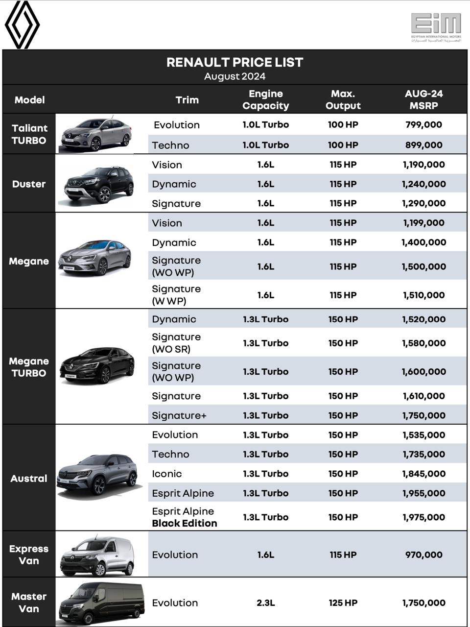 سيارات رينو، ارتفعت أسعار سيارات رينو، بقيمة مالية تصل نحو 100 ألف جنيه، ومن المقرر تطبيقها بداية من يوم الأحد المقبل داخل المعارض المصرية، وشملت سيارات رينو ميجان.