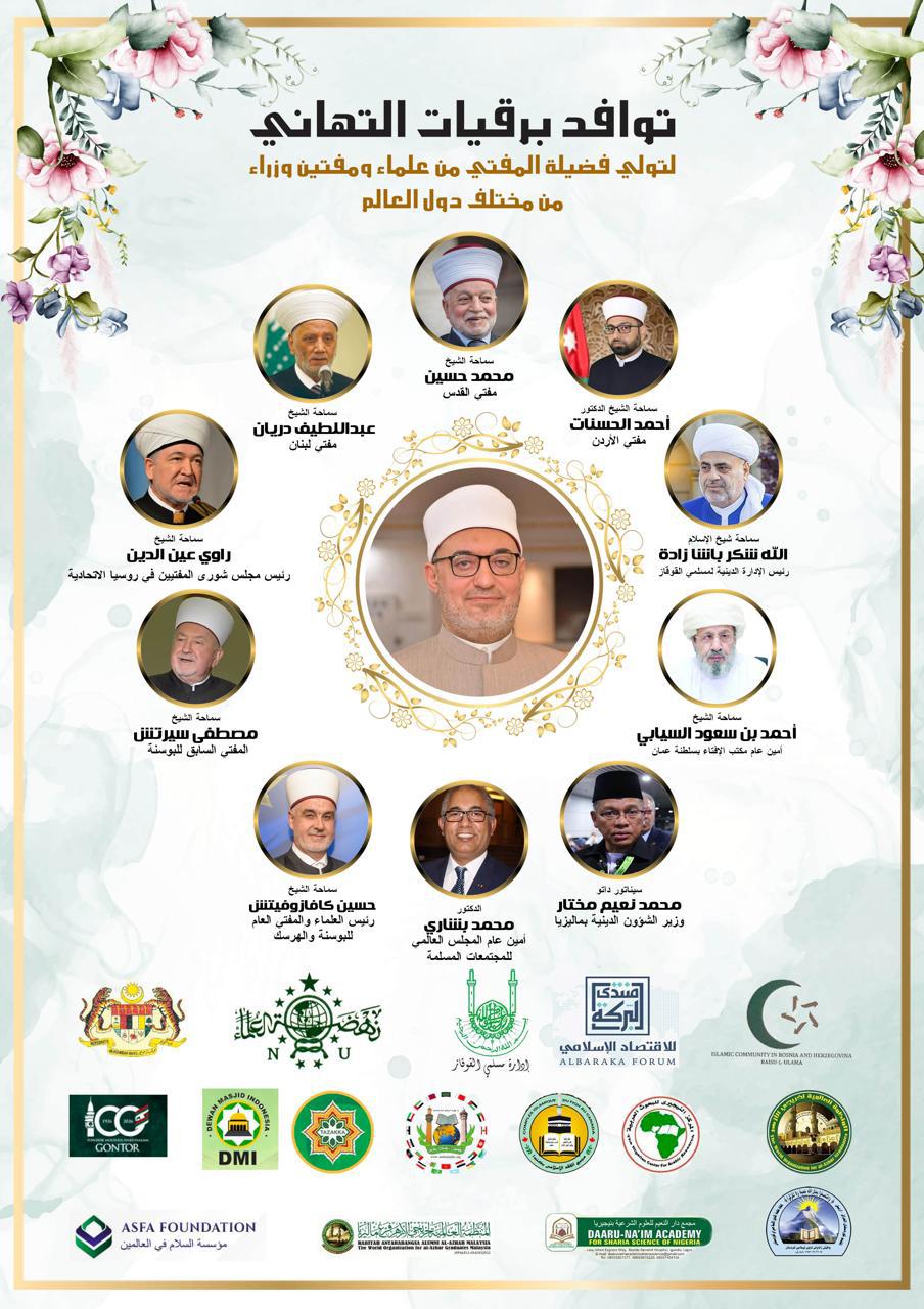 بالإضافة إلى برقيات تهاني من كلٍّ من: الدكتور ناصر النشوي، رئيس مجمع الفقه الإسلامي بكندا، والدكتور عبد الله ويسي، رئيس اتحاد علماء الدين الإسلامي في إقليم كردستان العراق، والشيخ عمران إيليخا، الرئيس العام لمجمع دار النعيم للعلوم الشرعية بنيجيريا، والبروفيسور ضمير محيي الدينوف، النائب الأول لرئيس الإدارة الدينية لمسلمي روسيا الاتحادية، والمنظمة العالمية لخريجي الأزهر في ماليزيا وتايلاند وعدد من الدول الأخرى، ود. نصرت رمضان، رئيس الجمعية الثقافية والخيرية بجمهورية مقدونيا الشمالية.