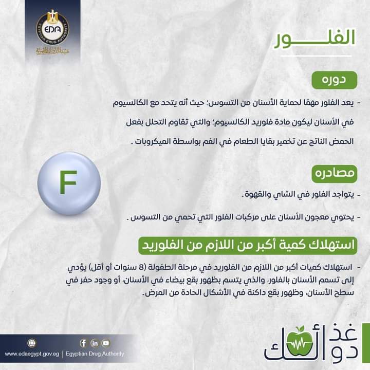 أوضحت هيئة الدواء المصرية أهمية عنصر الفلور حيث يتحد مع الكالسيوم في الأسنان ويكون مادة فلوريد الكالسيوم التي تقاوم التحلل بفعل الحمض الناتج عن التخمر في الطعام في الفم.