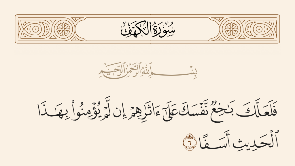 قال تعالى: «فَلَعَلَّكَ بَاخِعٌ نَفْسَكَ عَلَى آثَارِهِمْ إِنْ لَمْ يُؤْمِنُوا بِهَذَا الْحَدِيثِ أَسَفًا».