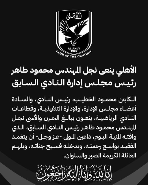 نعي، الكابتن محمود الخطيب، رئيس النادي الأهلي، وأعضاء مجلس الإدارة، والإدارة التنفيذية، وقطاعات النادي الرياضية، ببالغ الحزن والأسى نجل المهندس محمود طاهر رئيس النادي السابق، الذي وافته المنية اليوم، داعين المولى -عز وجل- أن يتغمد الفقيد بواسع رحمته، ويدخله فسيح جناته، ويلهم العائلة الكريمة الصبر والسلوان.