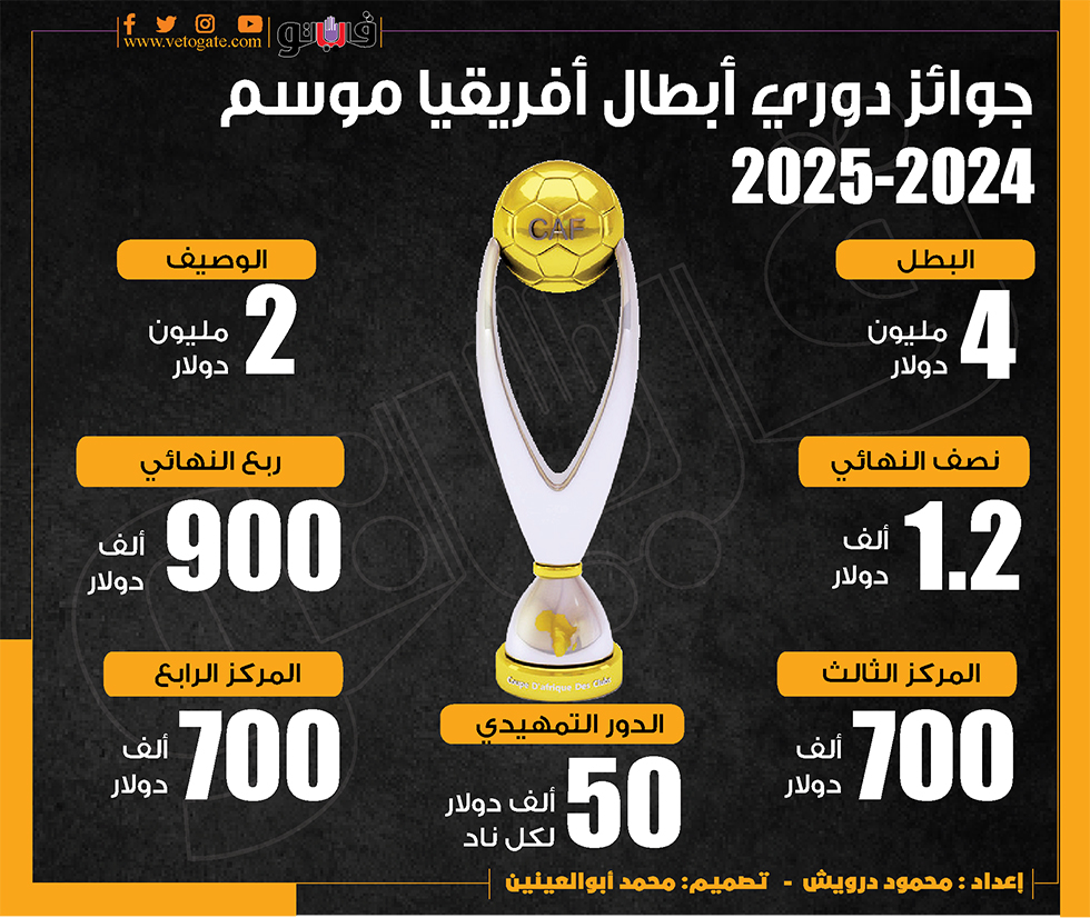 جوائز دوري أبطال أفريقيا موسم 2024 -2025 (إنفوجراف) السبت 17/أغسطس/2024 - 02:37 م 8/17/2024 2:37:20 PM دوري أبطال أفريقيا محمود درويش شارك طباعة 18 حجم الخط شارك طباعة دوري أبطال أفريقيا كاف جوائز دوري ابطال افريقيا الأهلي دوري الابطال