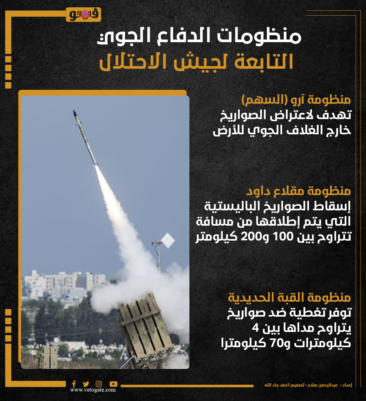 منظومات الدفاع الجوي التابعة لجيش الاحتلال (انفوجراف) الثلاثاء 20/أغسطس/2024 - 11:00 ص 8/20/2024 11:00:31 AM القبة الحديدية، فيتو عبدالرحمن صلاح شارك طباعة 18 حجم الخط شارك طباعة منظومة آرو منظومة مقلاع داود مقلاع داود القبة الحديدية منظومة القبة الحديدية جيش الاحتلال